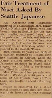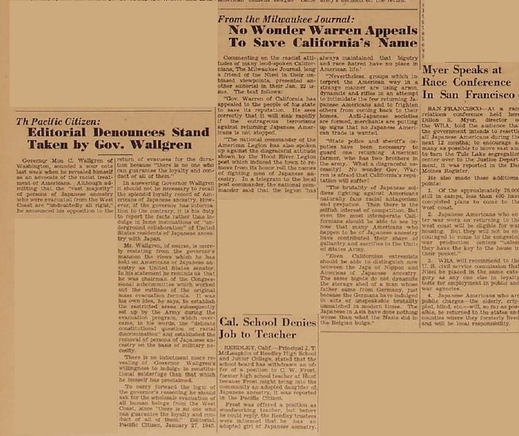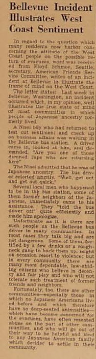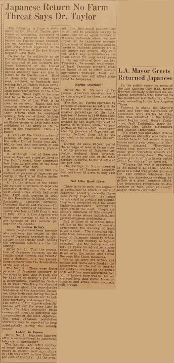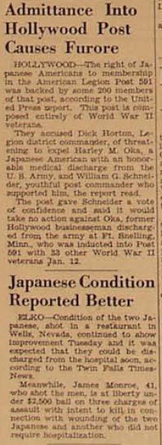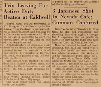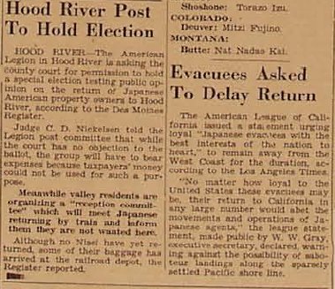 Page 1: Nominating convention of co-op board set; spring around the corner?; closing of fish market clarified; draft delinquents taken to Boise; evacuees receive pay in cash upon relocation; farm land returned to bureau; council election postponed due to lack of candidates; express services discontinued under new ruling; three mess halls subject to closure; twelve men named to special advisory commission; 15-day inventory of mess operation put into effect; California attorney general urges equal rights to relocatees; overseas veterans visit parents; postcards from Japan at post office; Sumitomo bank to pay dividends; 12 visit coast on short-term leave; truck accident; wins purple heart.