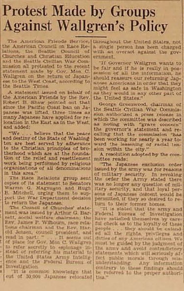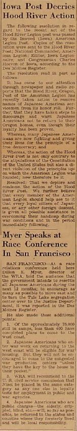 Page 1: Recruiting underway for ordinance work at Sioux; depot lifts restrictions on evacuees; Myer speaks before 1500 residents at gym; indefinite leave procedure clarified; $33.20 collected in 'dime' drive; news of individual soldiers; Myer opposes housing PWs in WRA centers; two draft evaders sentenced in Boise; all-center parlay ends this week; co-op board of directors elected.