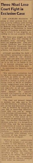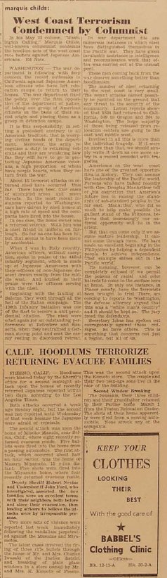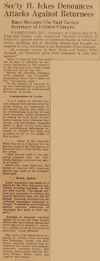 Page 1: Memorial services honor twelve Hunt servicemen; news of individual soldiers; Memorial Day services; Nisei American artillery unit aids in V-day push; capture vandals mayor tells police chief; Seattle Friends committee aids returnees from Hunt; U of Missouri fires Nisei instructor (and three others.)