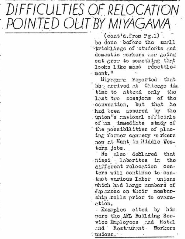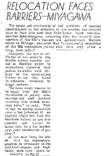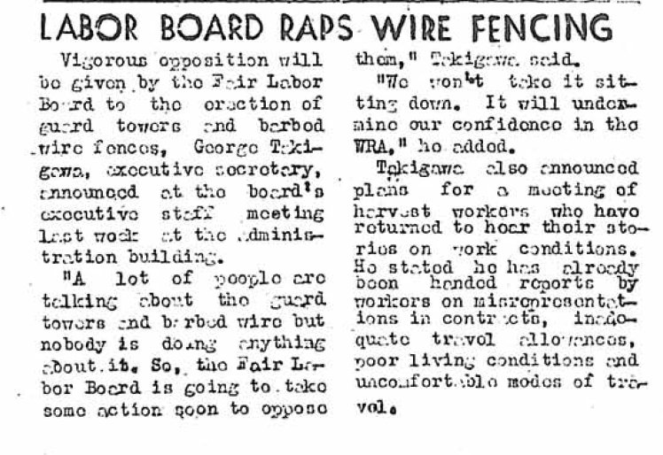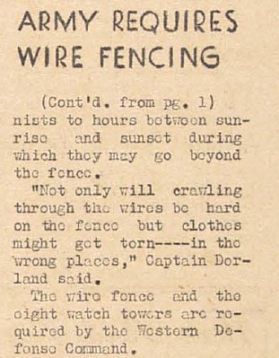 Page 4: Labor study forms being sent out; delegates leave for Utah confab; construction of guard towers and wire fences is held up due to possibility the camp itself will be expanded in area; returning workers given housing aid; Essene returns after lecturing at Stanford U.; couples only dance.