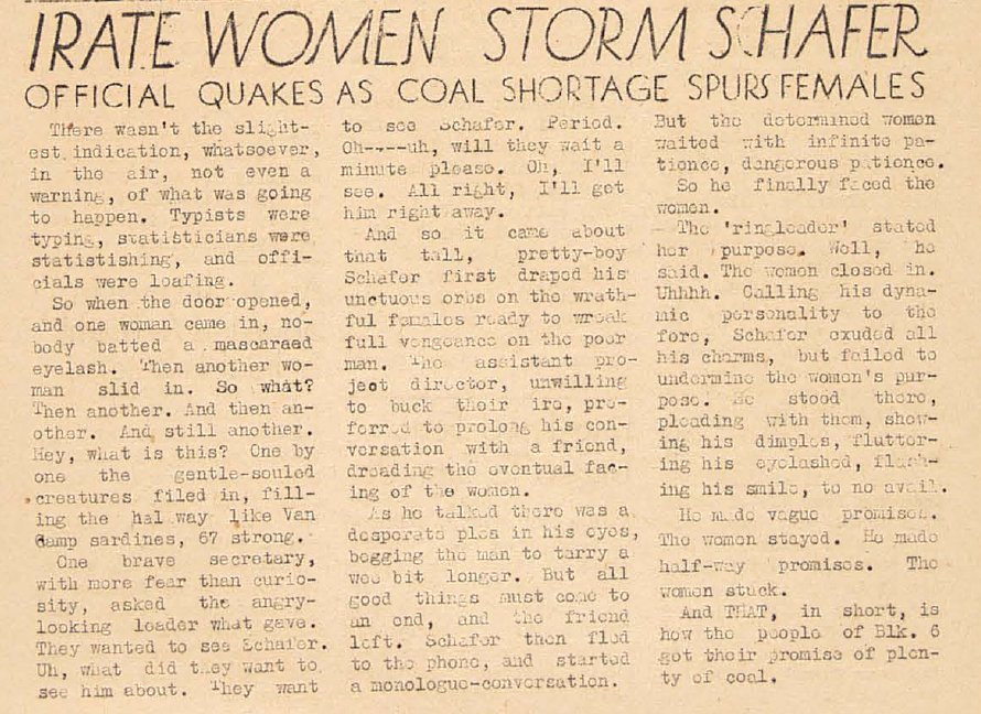 Page 9: Two handle grievances of workers; computation of clothing allowances begins soon; dance tonight; package received, but whose it it?; a marriage; last rites held; males barred at Jr. Girls dance.