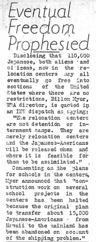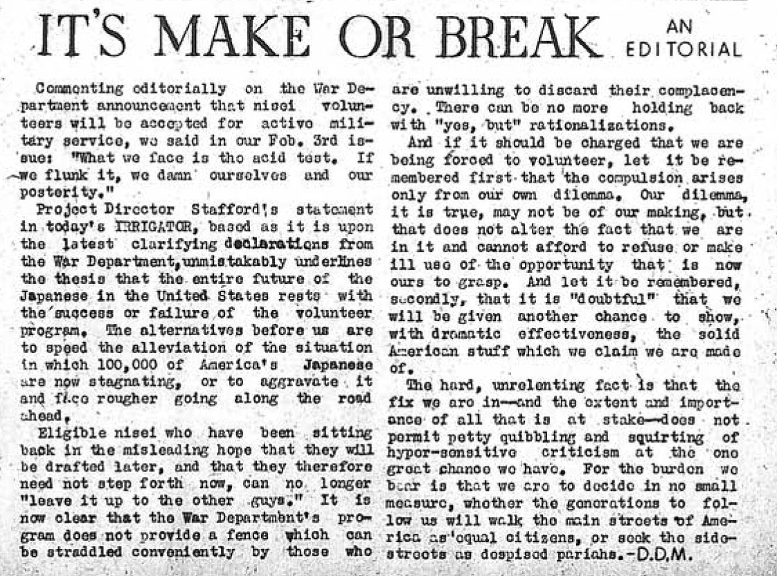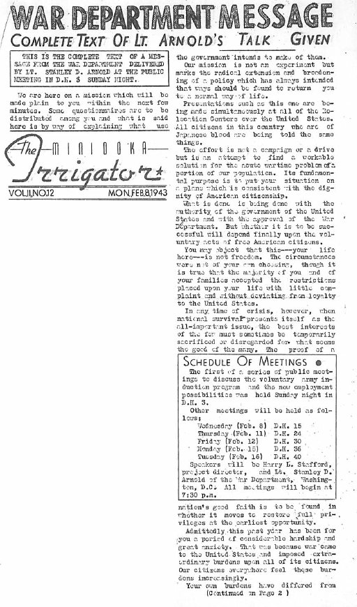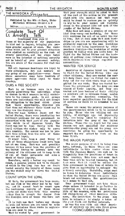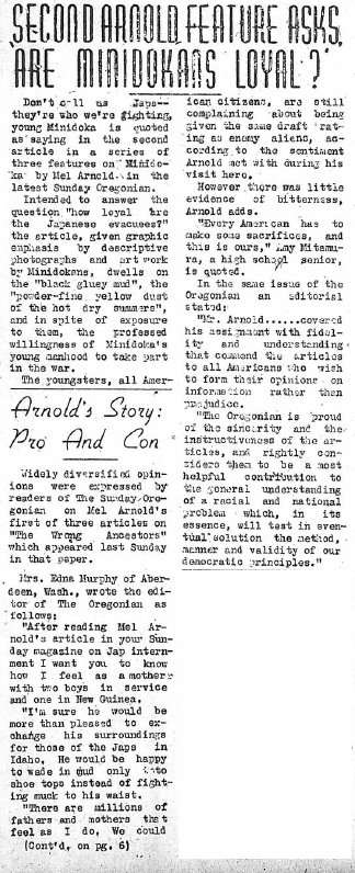 Page 2: Evacuees sought for farm work; editorial: Our Two Immortals; goodbye Mr. Mimeo; brothers article continues from page 1; move to accept Nisei lauded.