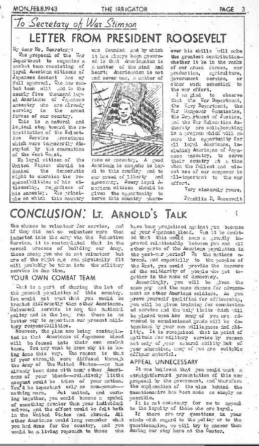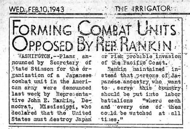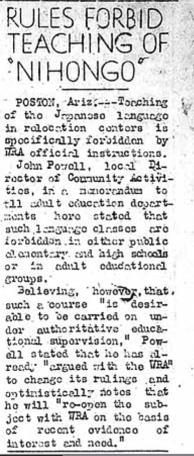 Teaching of Japanese is not allowed. I can understand how people at the time had questions about volunteering. There's all this pressure to get the Nisei to volunteer, yet they can't move back to their homes, they can have short-wave radios, and they can't learn their own language, all this plus their living in barbed-wire camps. Why volunteer to fight for someone who has taken away your rights and treats you pretty much like dirt.