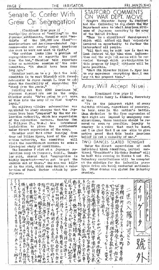 The articles continue on this second page. The segregation thinking eventually became the Tule Lake segregation center, where those who were considered disloyal, for one reason or another, were concentrated, while those who were considered loyal were moved to other camps.