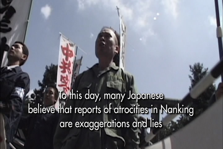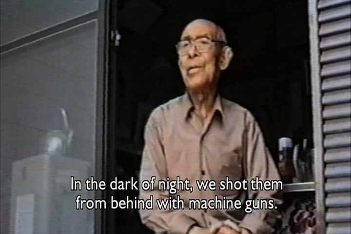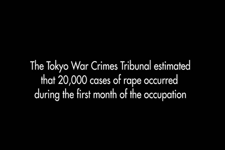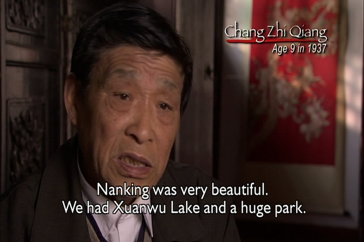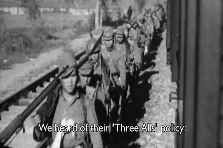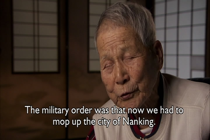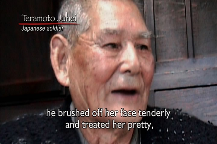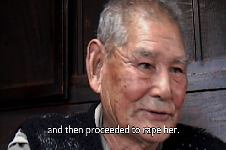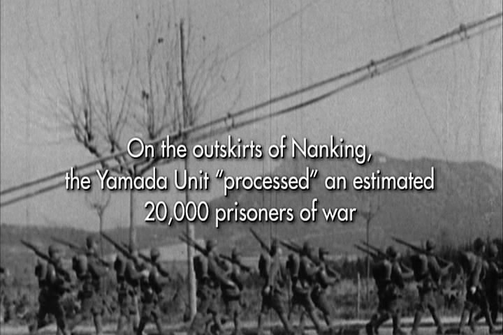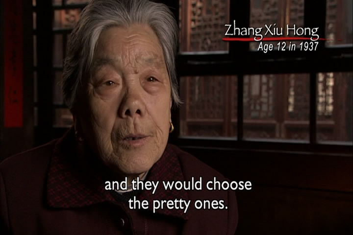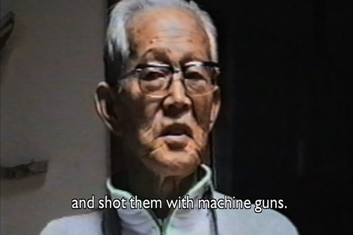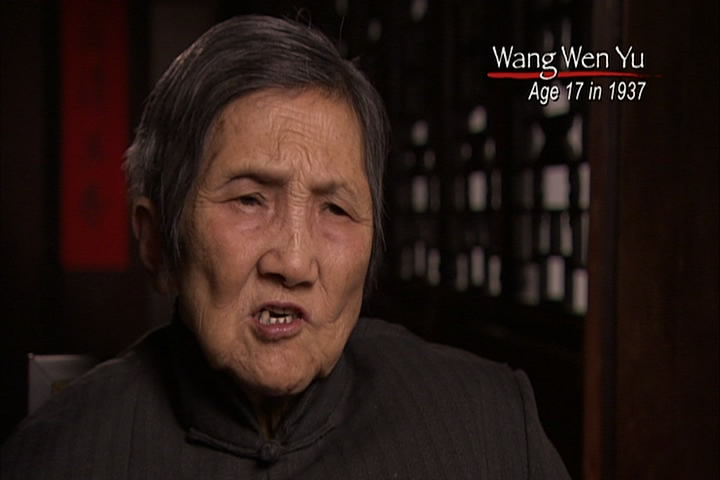 The woman then says how a Japanese soldier told her he wanted to have sex with her. She had cut her hair, though, and claimed she was a boy and he went away. The film then talks about how the Japanese roped Chinese men together and took them elsewhere and executed all of them.
