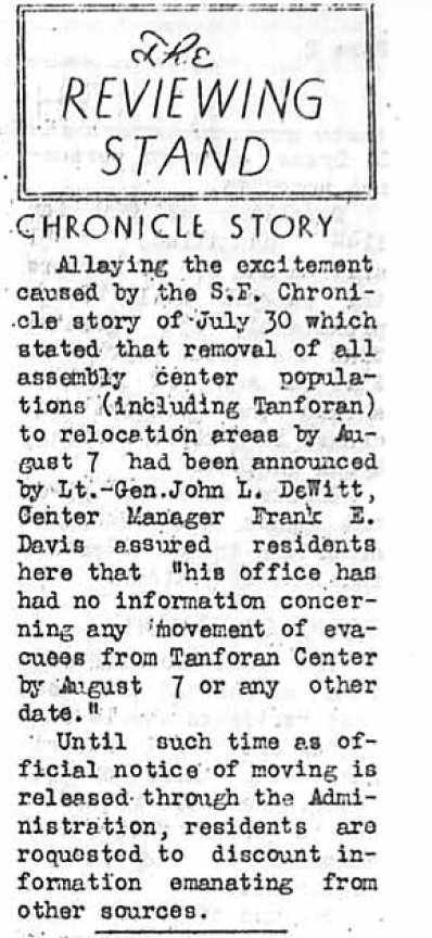Apparently the anti-Japanese San Francisco Chronicle had carried an article that those in the assembly camps would be moved to relocation areas, and the residents found out about this from the newspaper and not from the camp administration.