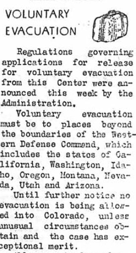 There's an article, part of which I have here, about voluntary evacuation, but residents cannot go to a number of different states. This follows the idea of forcing the Japanese to spread out through the U.S. Also, the people in the states indicated really don't want them back.