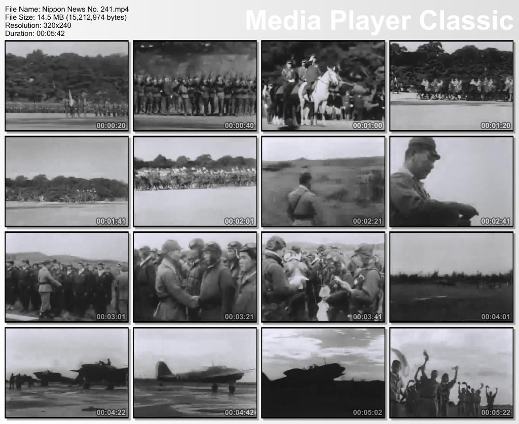 Military review of the Imperial Japanese Army that was held at the East Gardens of the Imperial Palace on January 8, 1945 and newsreel of the Imperial Japanese Navy, stationed in the Philippines, that seems to have been taken in December 1944. Censored by the Imperial Navy and the Imperial Japanese Army. The clip is in Japanese and starts off showing marching soldiers. It seems Hirohito is watching them march. There are a lot of cavalry seen. The next section is an officer talking to kamikaze pilots.