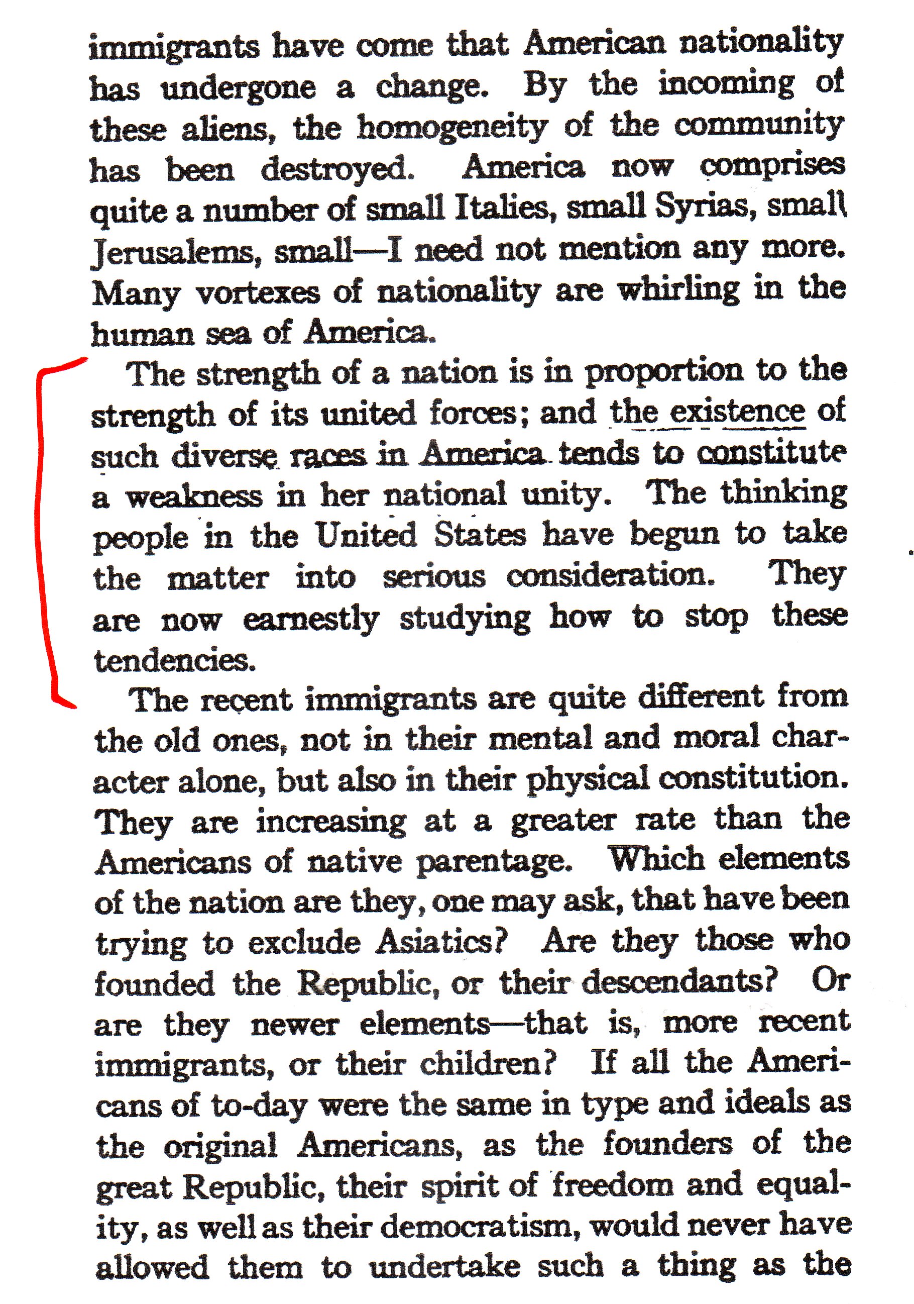 “..the existence of such diverse races in America tends to constitute a weakness in her national unity.” Another quite stupid statement.