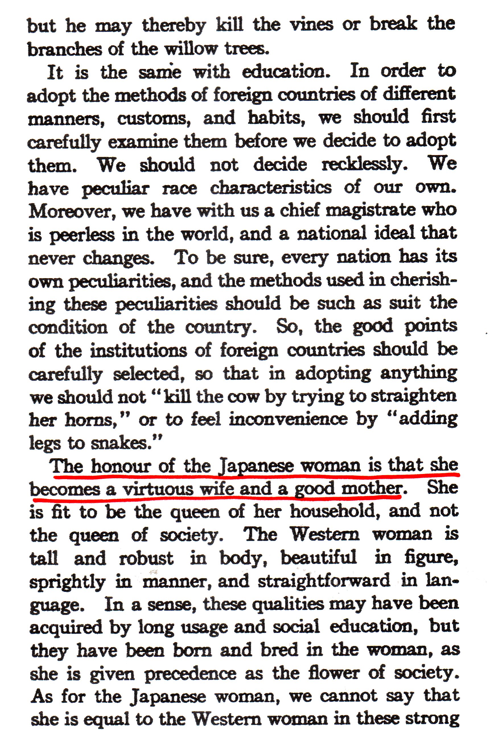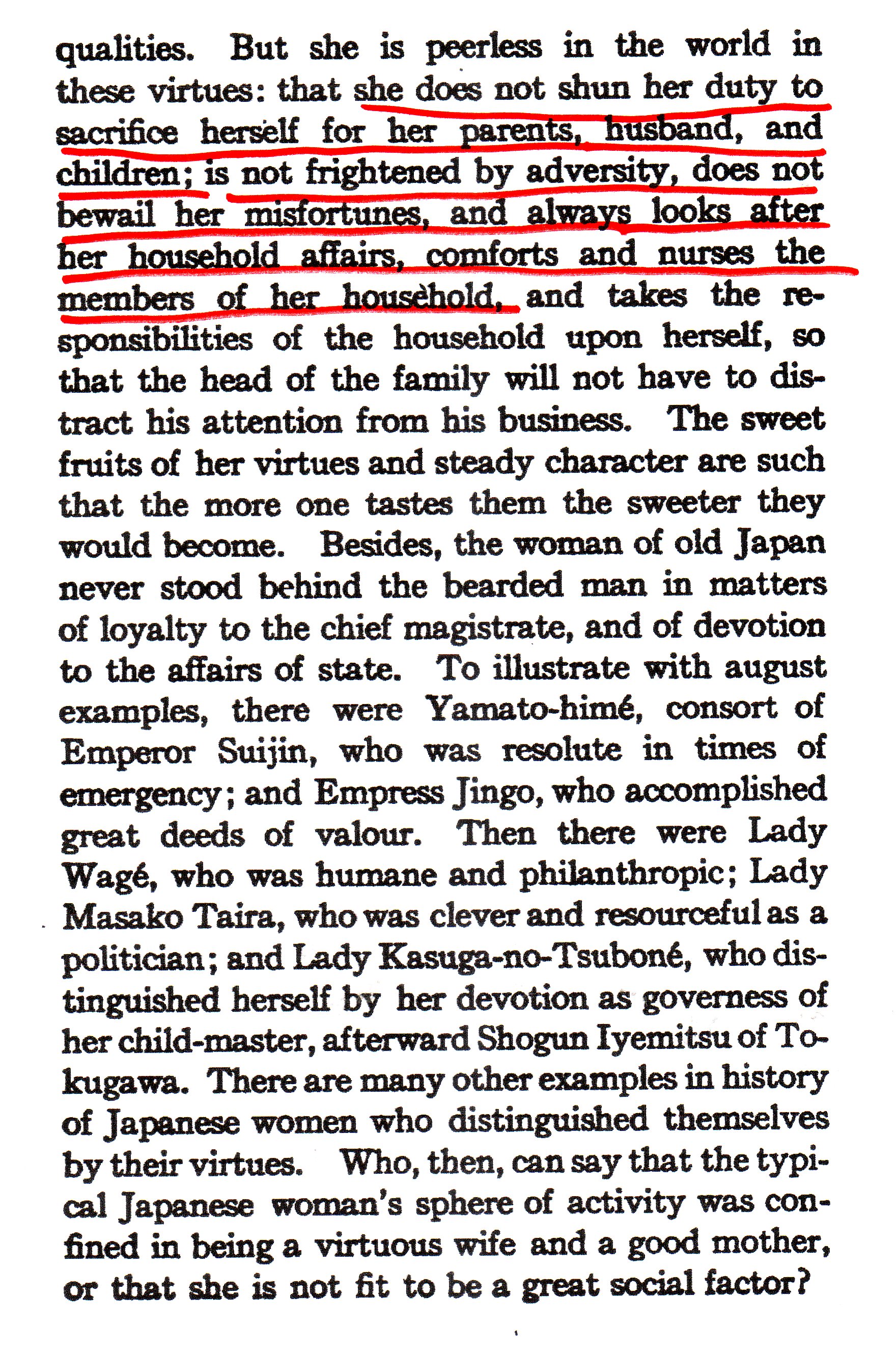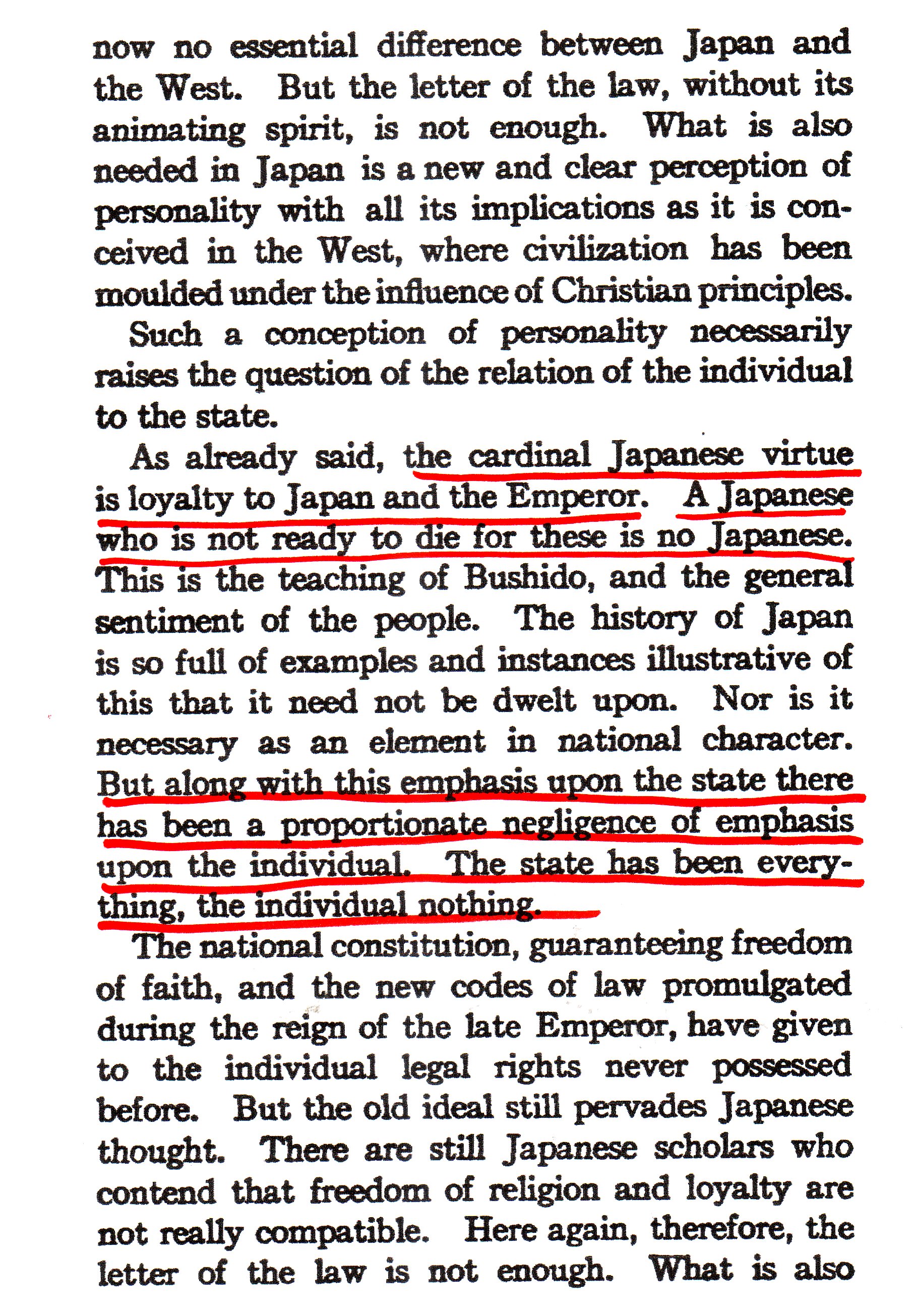 The emphasis in Japan is on the State, not the individual. The author also says that Japanese should be willing to die for their Emperor, something which became quite plain during World War II.