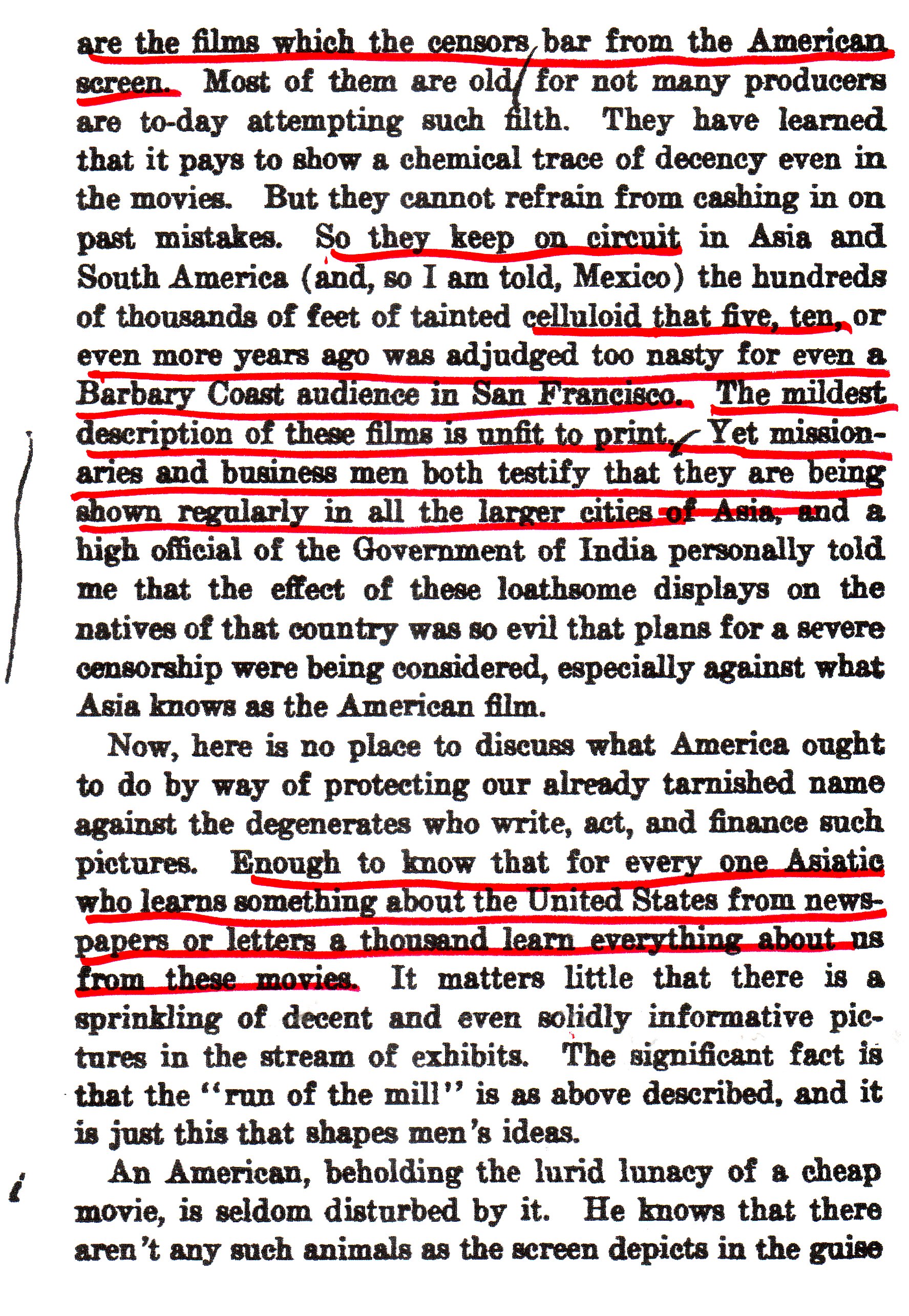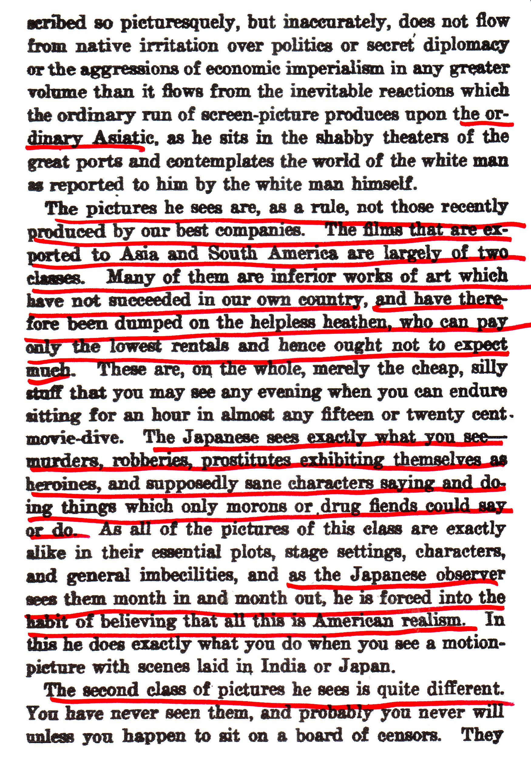The author says that the films from the U.S. that are shown in Japan are of low quality. “The Japanese sees exactly what you see-murders, robberies, prostitutes exhibiting themselves as heroines, and supposedly sane characters saying and doing things which only morons or drug fields would say or do.”