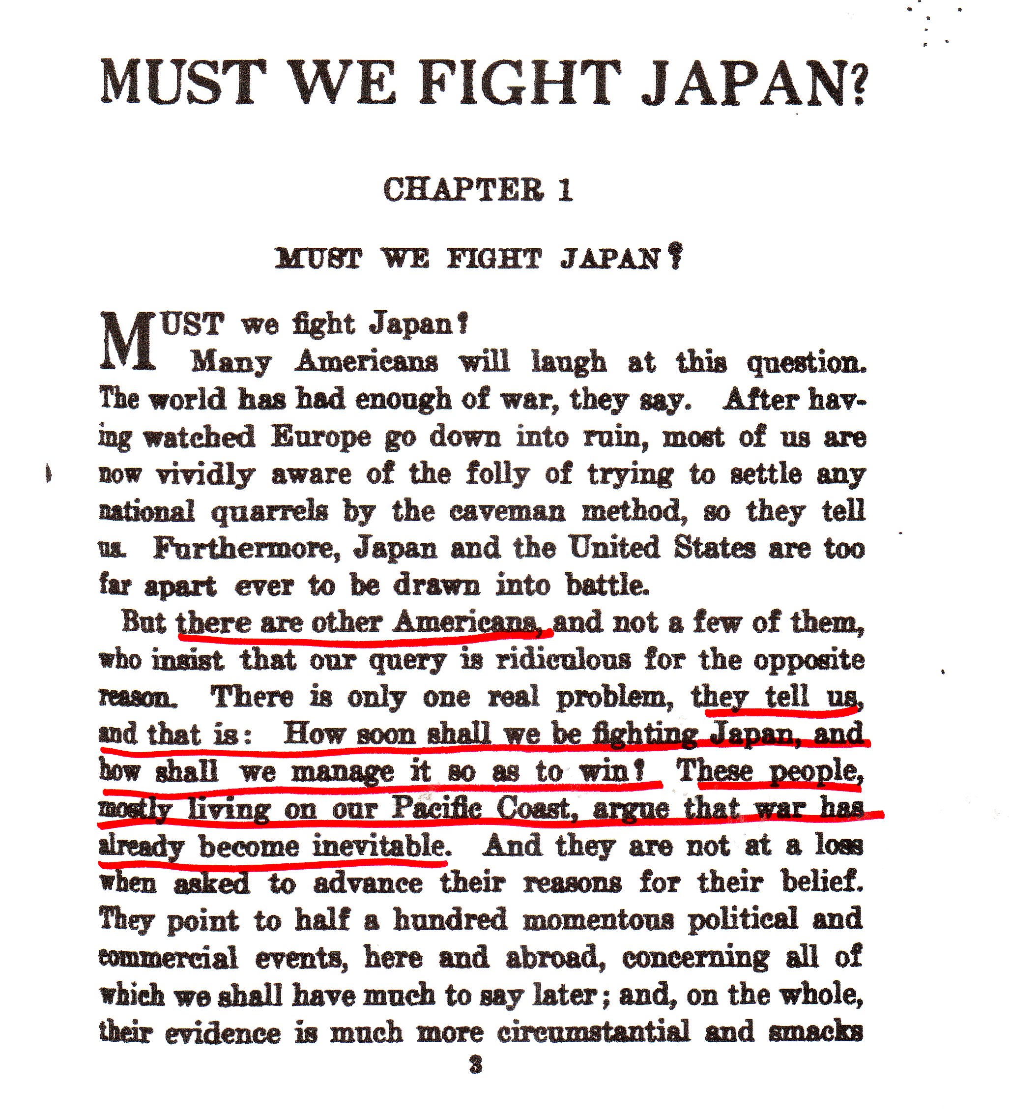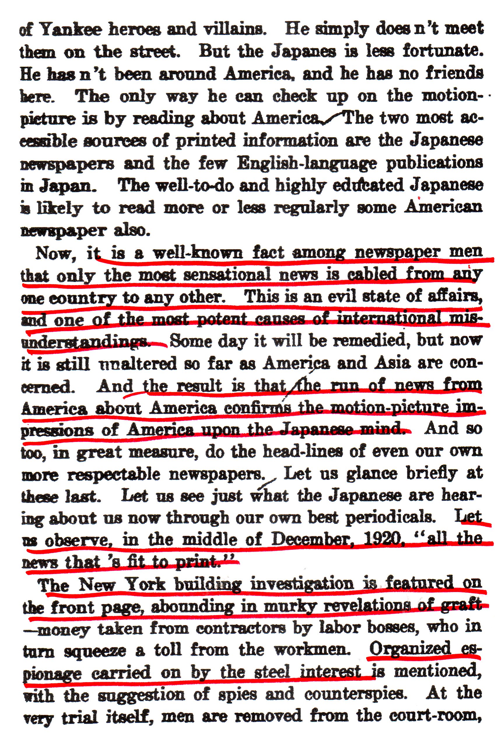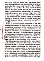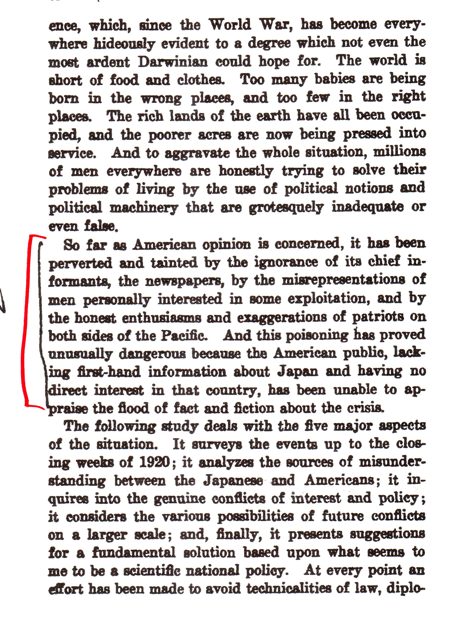 The author points out how the newspapers have poisoned opinion against the Japanese, and how they are “super-patriots” in both Japan and the U.S. that were making the situation even worse. The average American didn't know much about Japan, and depended on the papers for their information, and when the papers had their own agenda, problems arose.