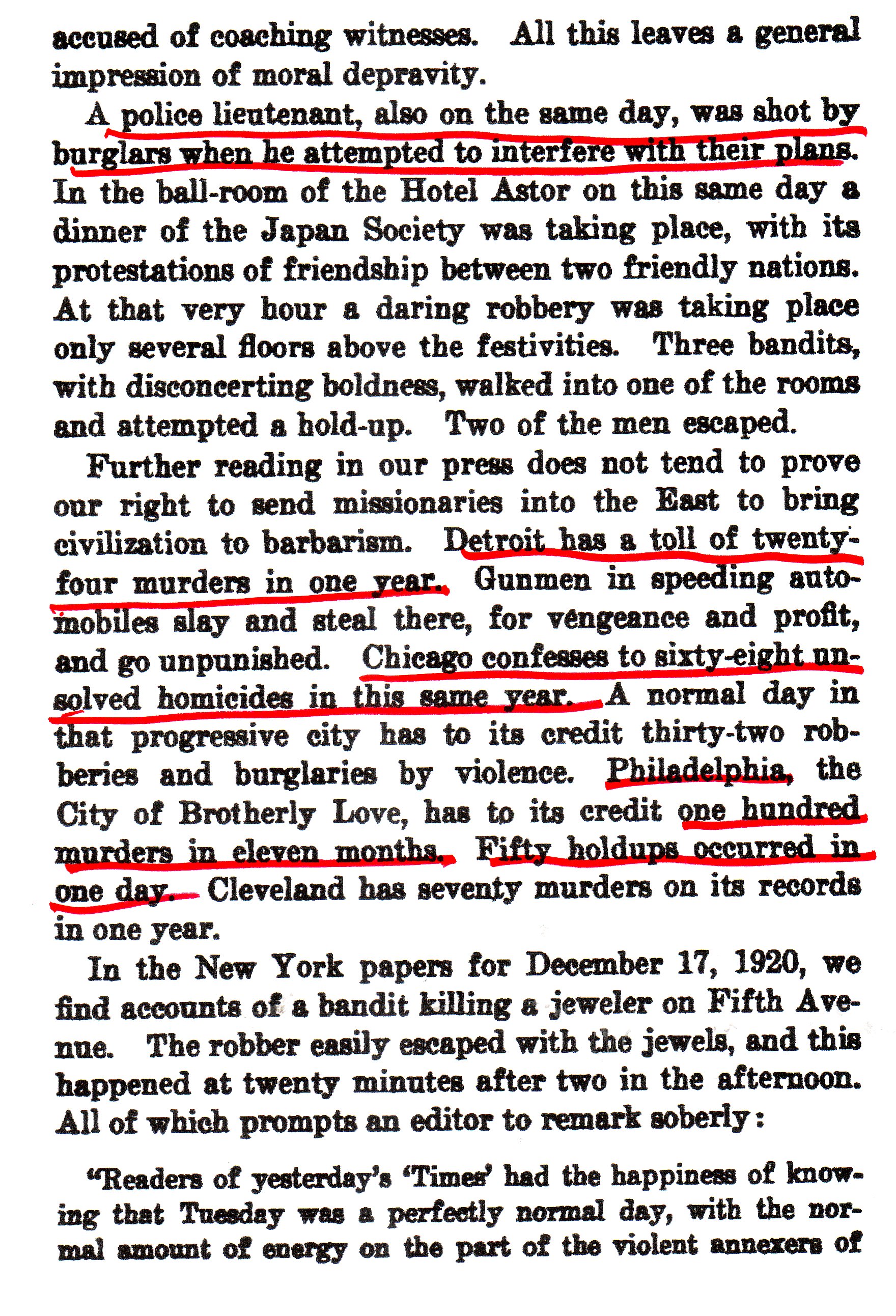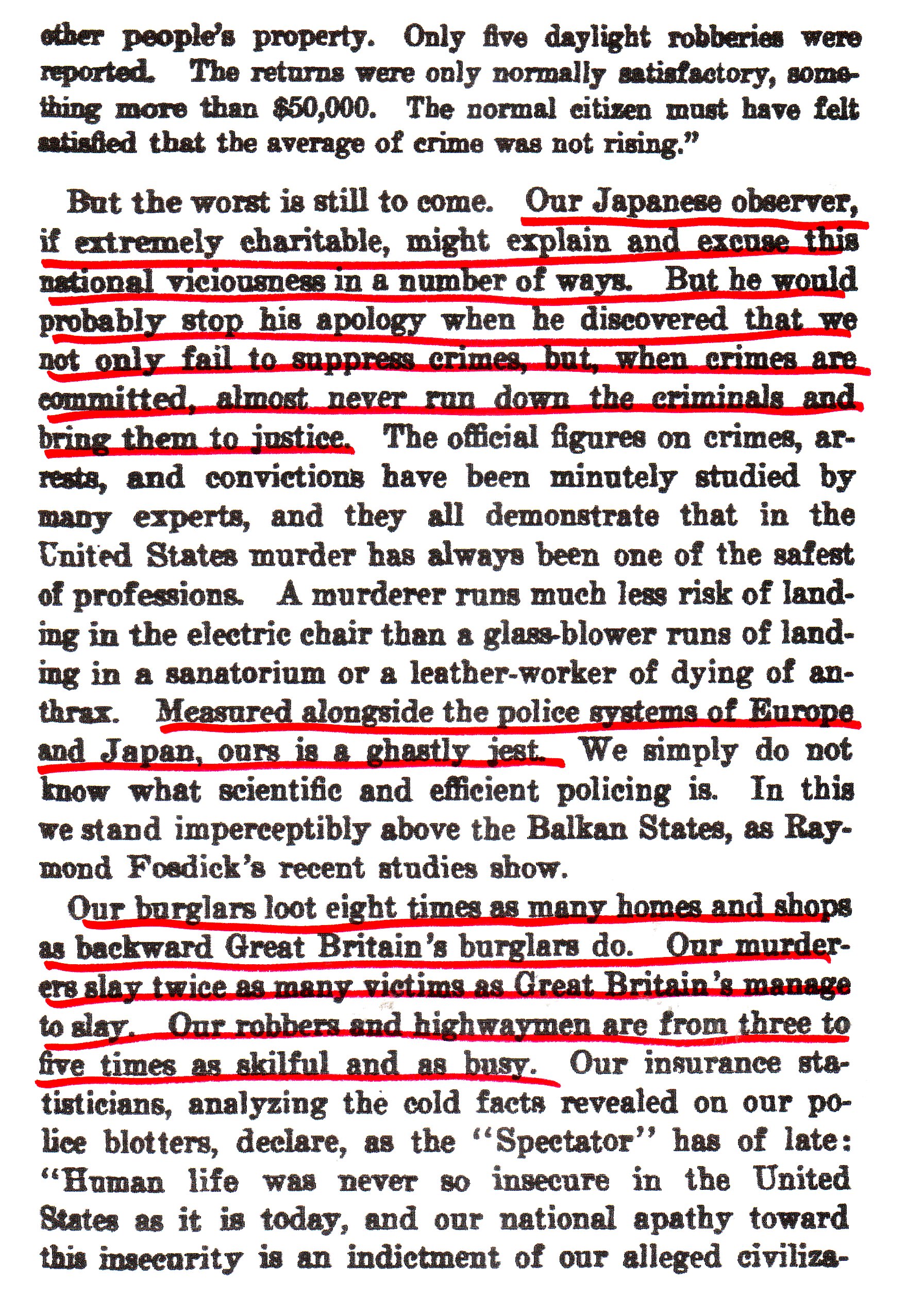 The author then goes after the U.S. criminal system, saying “Measured alongside the police systems of Europe and Japan, ours is a ghastly jest.” The U.S., he is saying, is a very violent country where criminals often get away without being caught or punished.