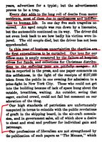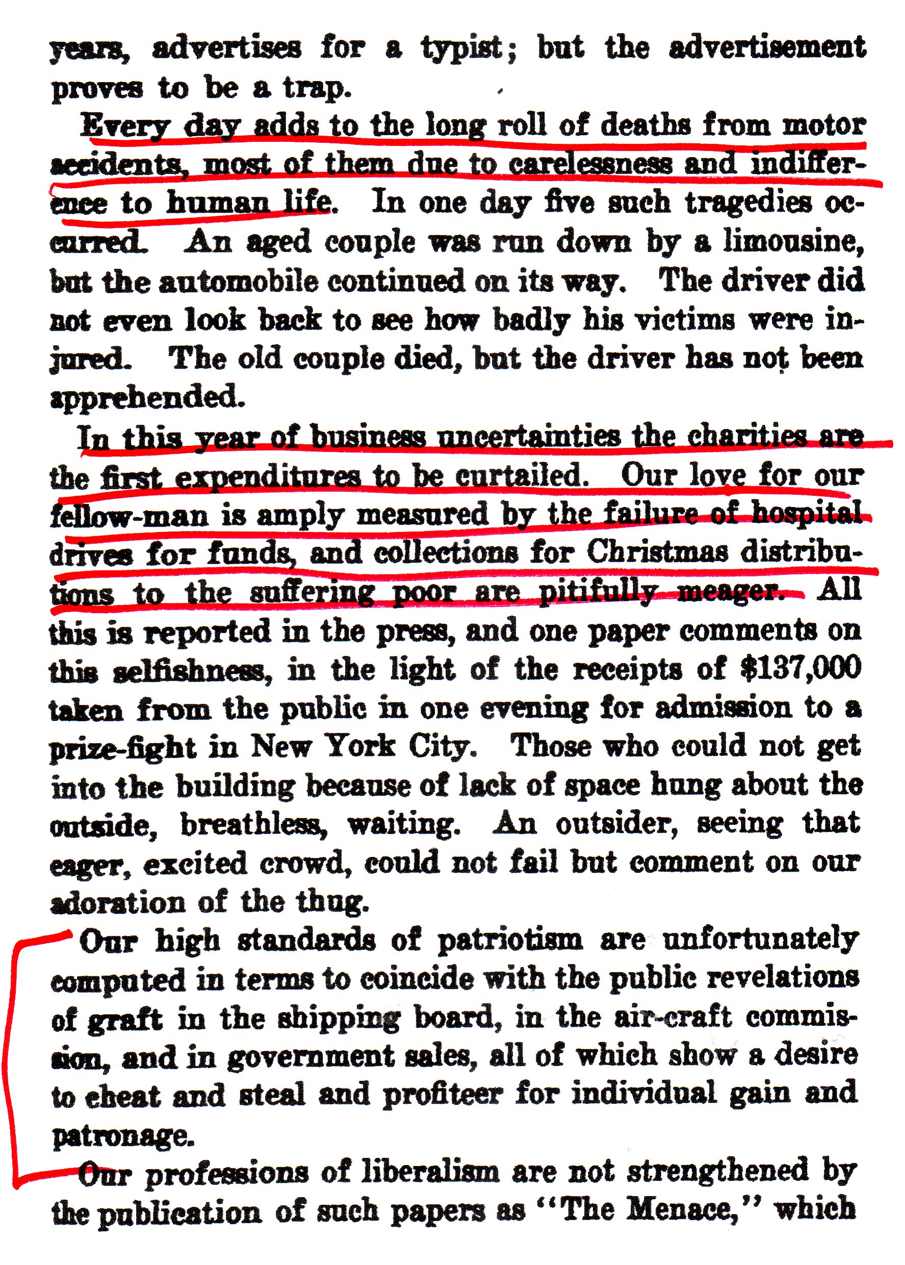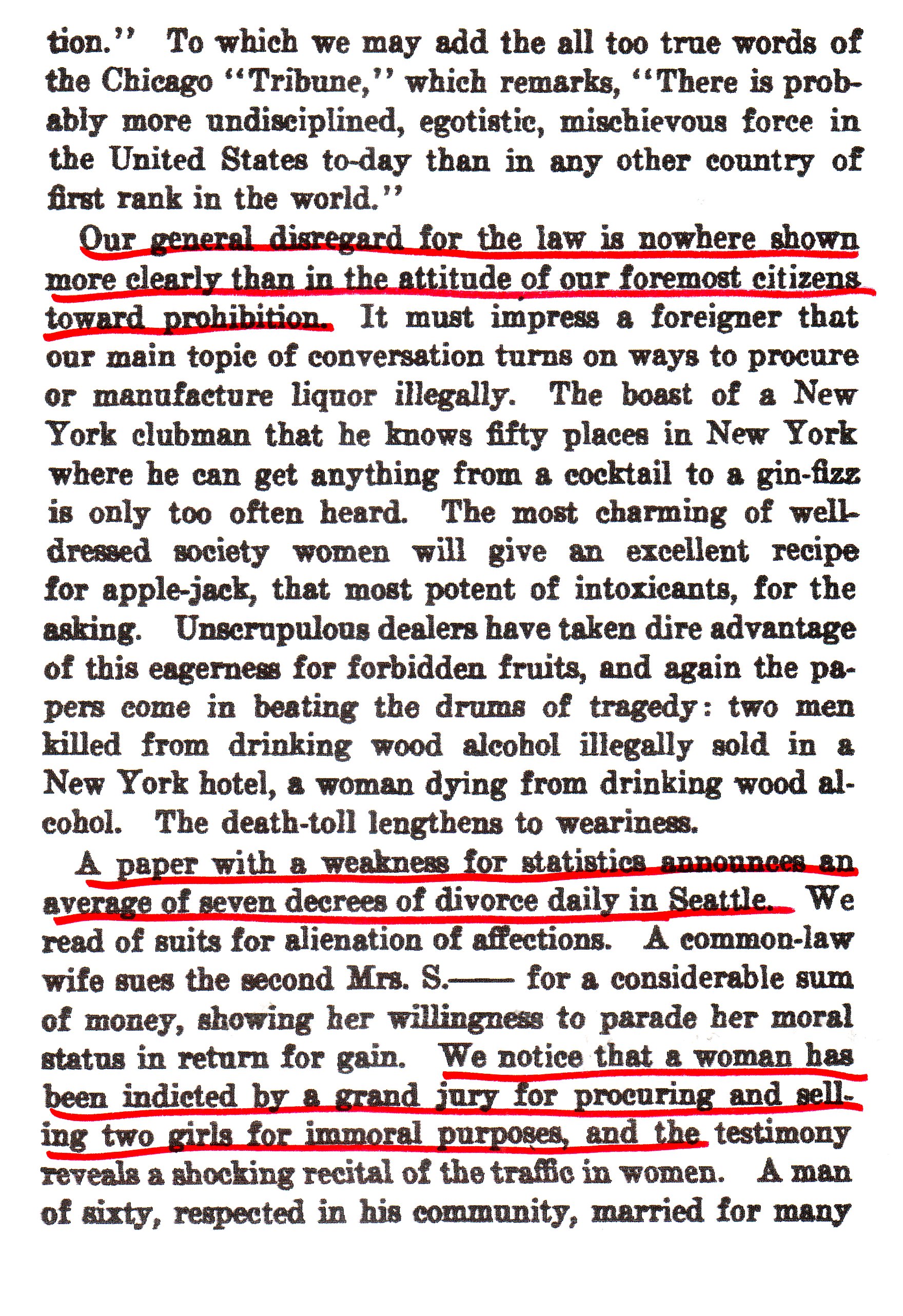 The author talks about prohibition (all alcohol was outlawed for a while, and that turned into a wonderful opportunity for big and small crooks, illegally made booze, and booze-running.) Then the author goes on to list moe negative types of newspaper stories.