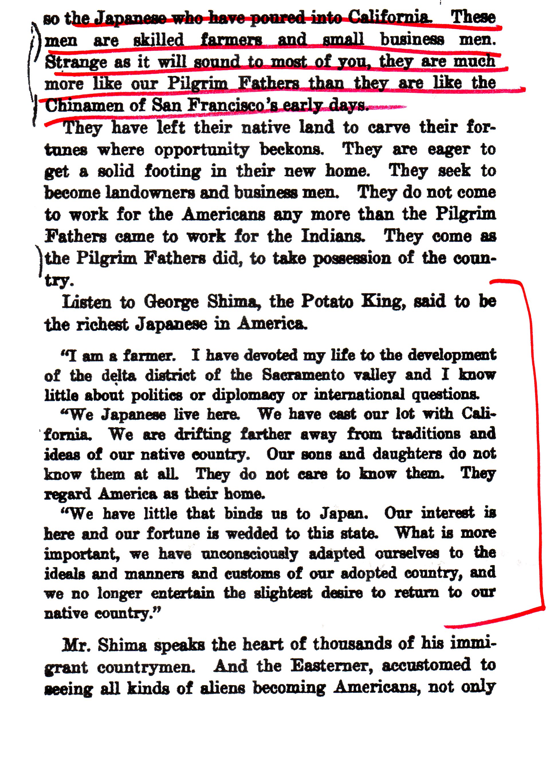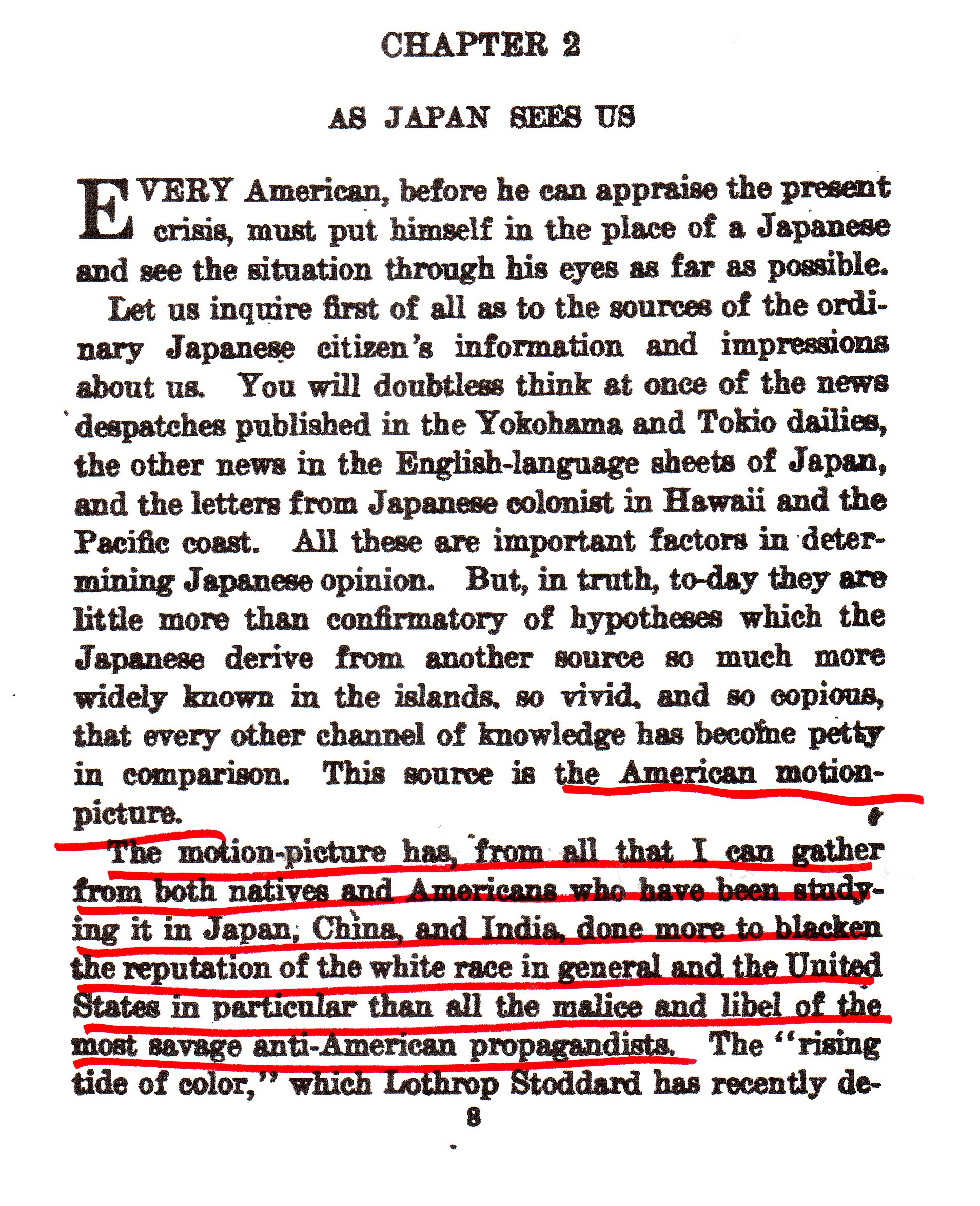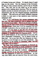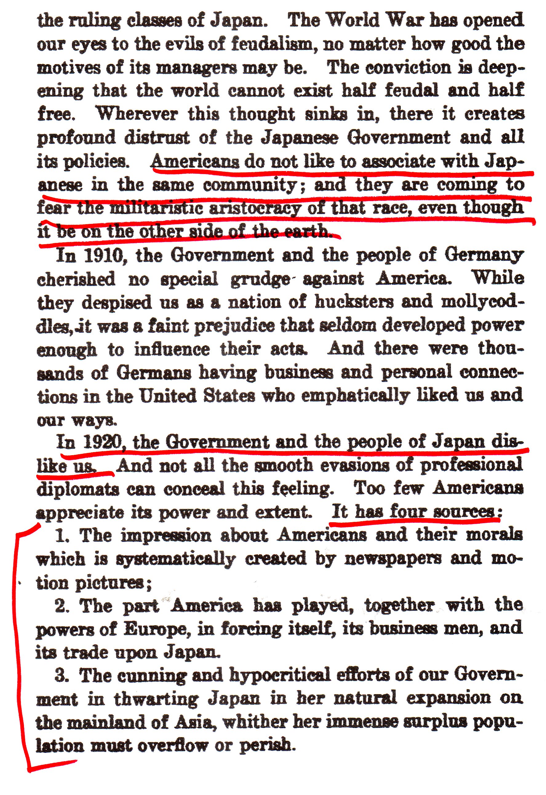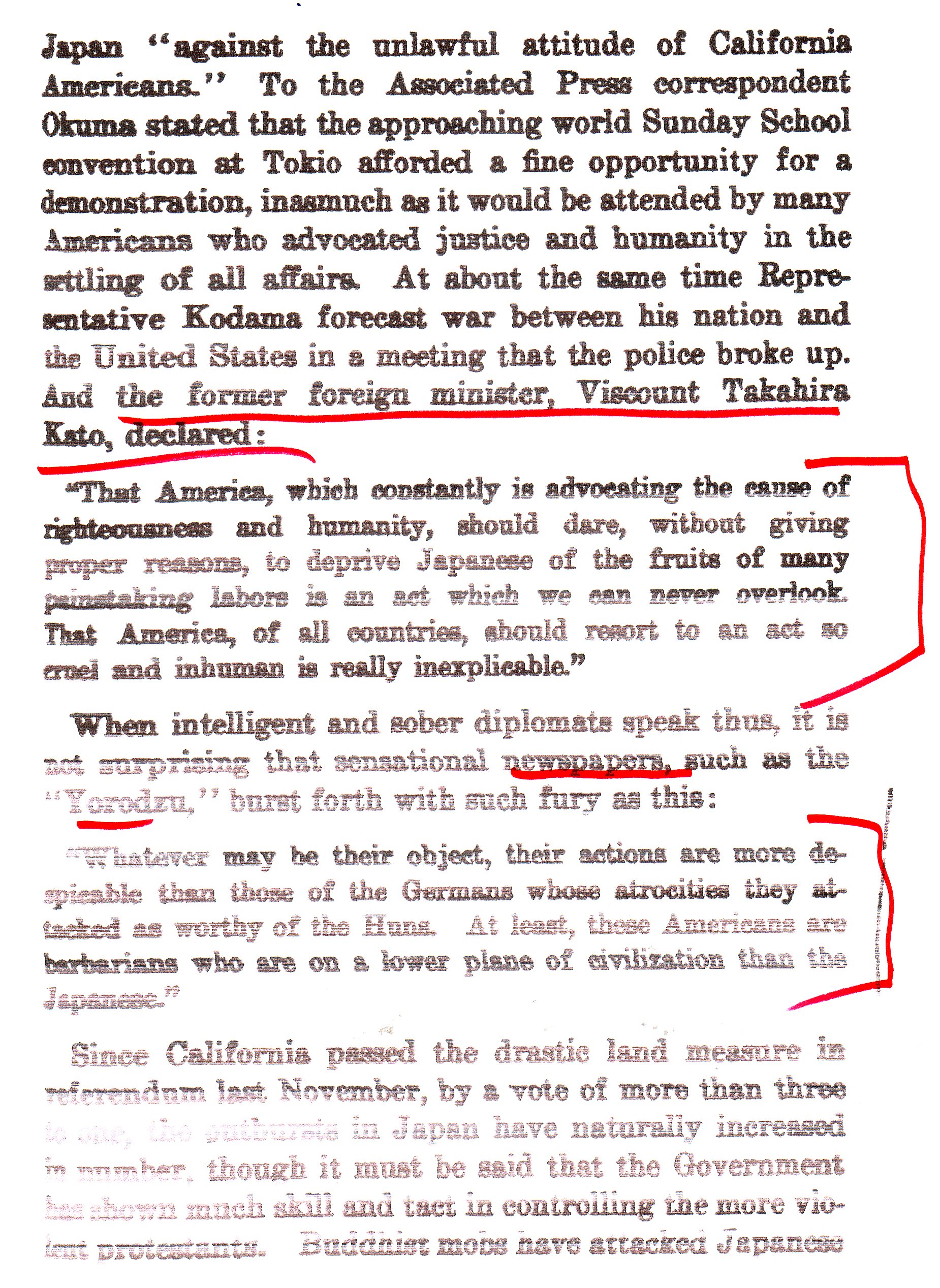 His writing continues. (The labor issue was one of the major issues that contributed to anti-Japanese prejudice on the West Coast.) The point of all these articles that the author cites is to show just how negative an image of the U.S. the Japanese were receiving from our own mass media.