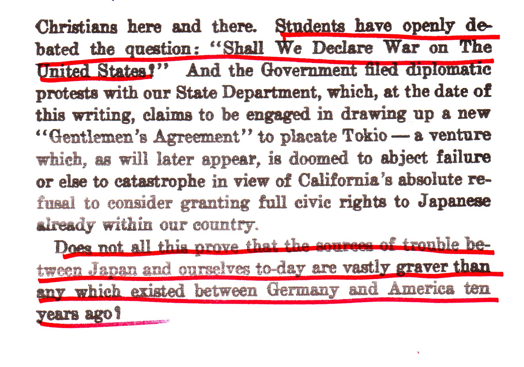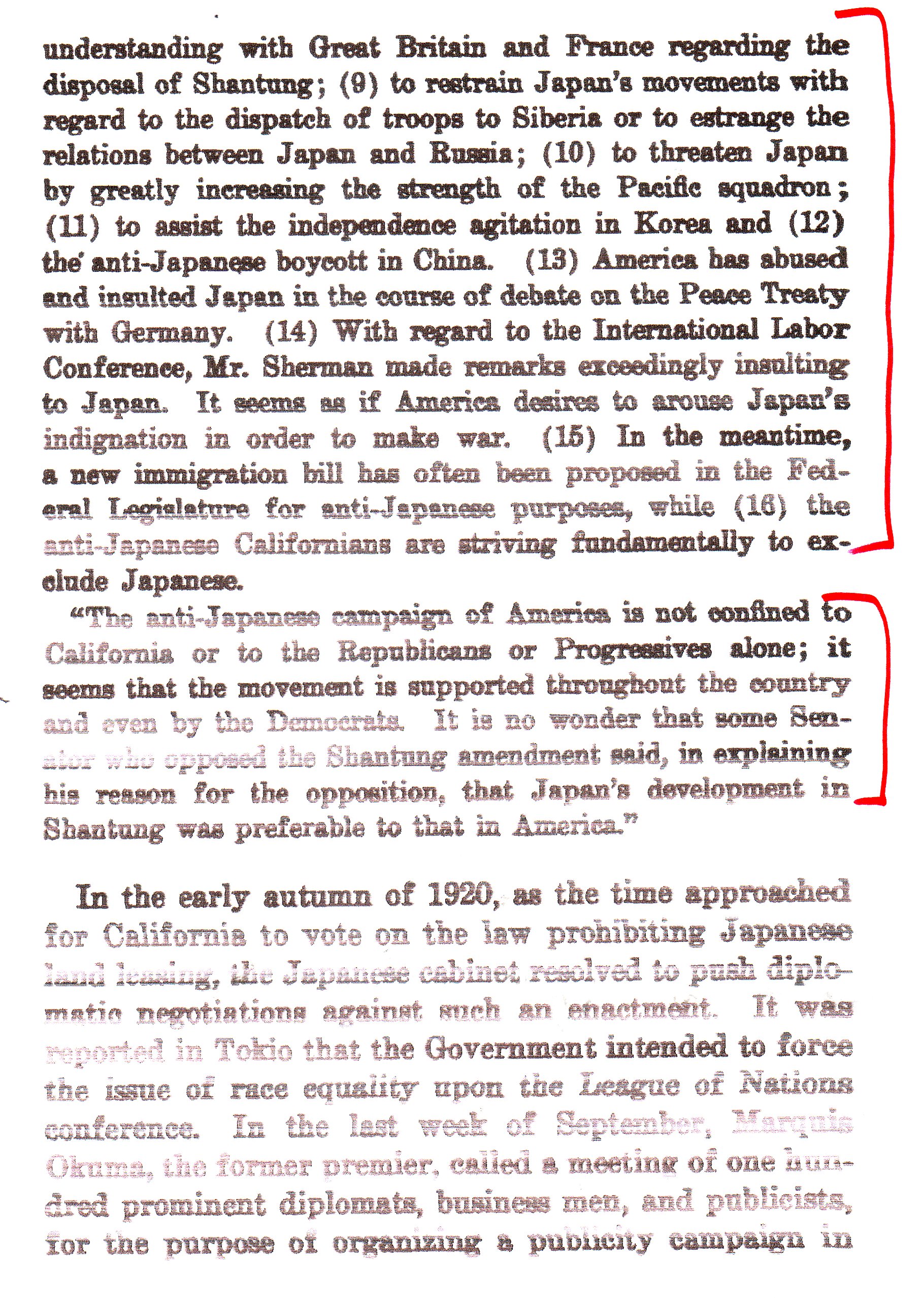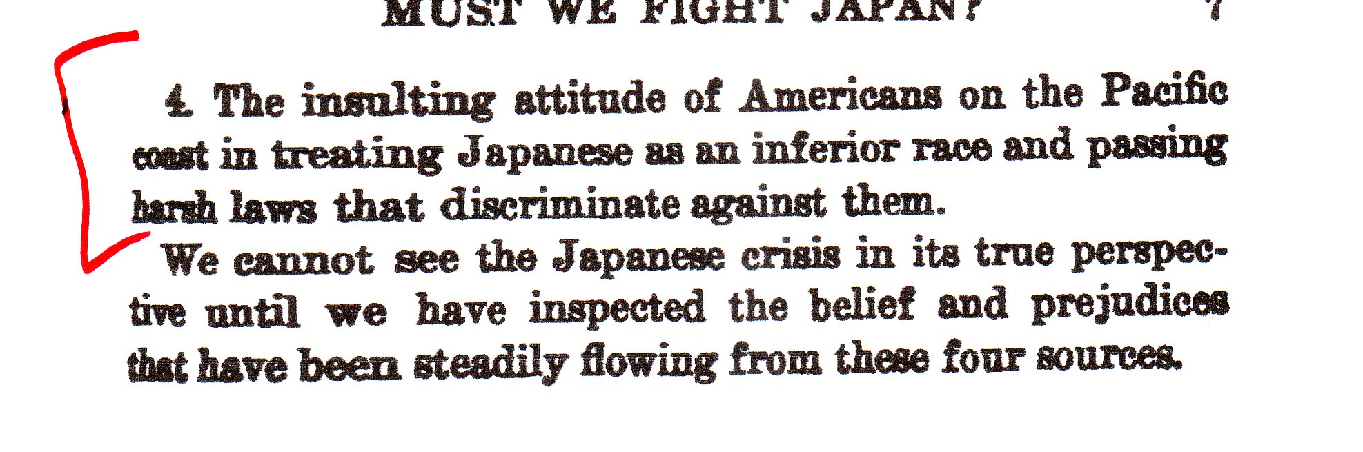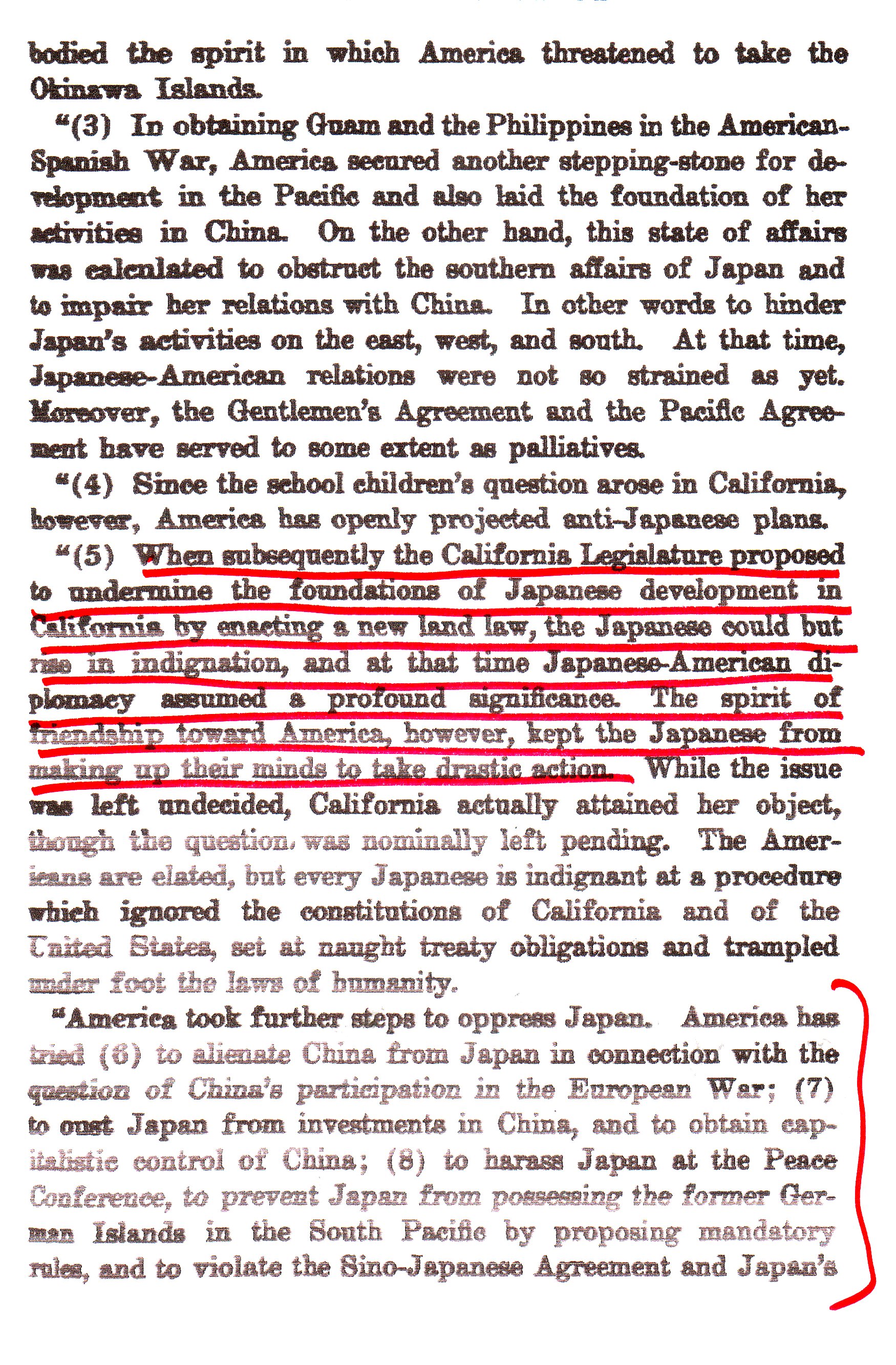 The author then talks about the anti-Japanese land laws, and other things that the U.S. was doing to “oppress” Japan.