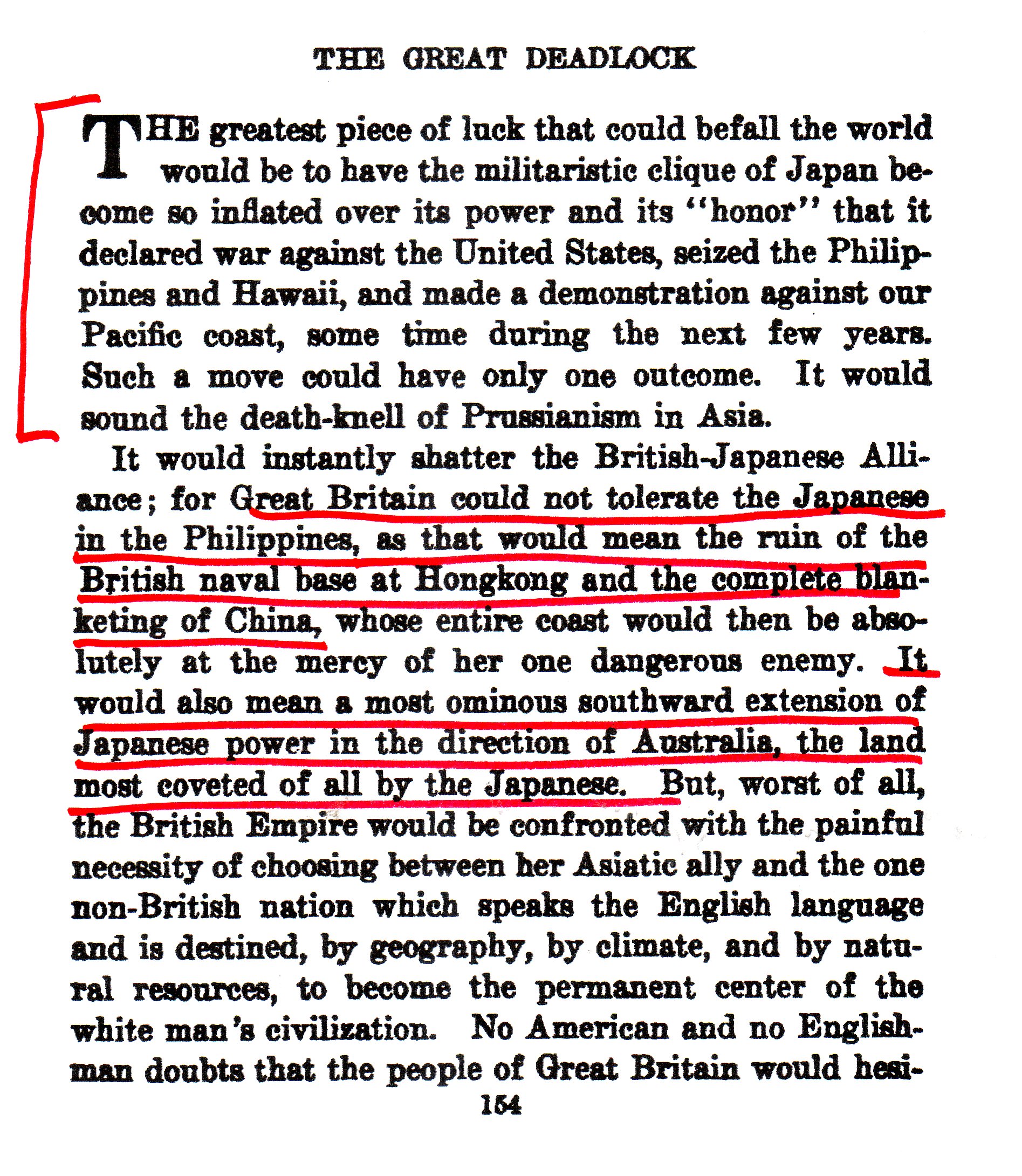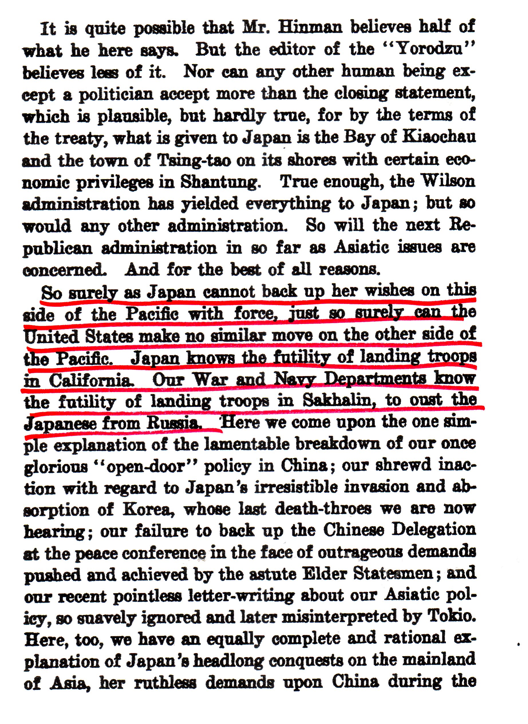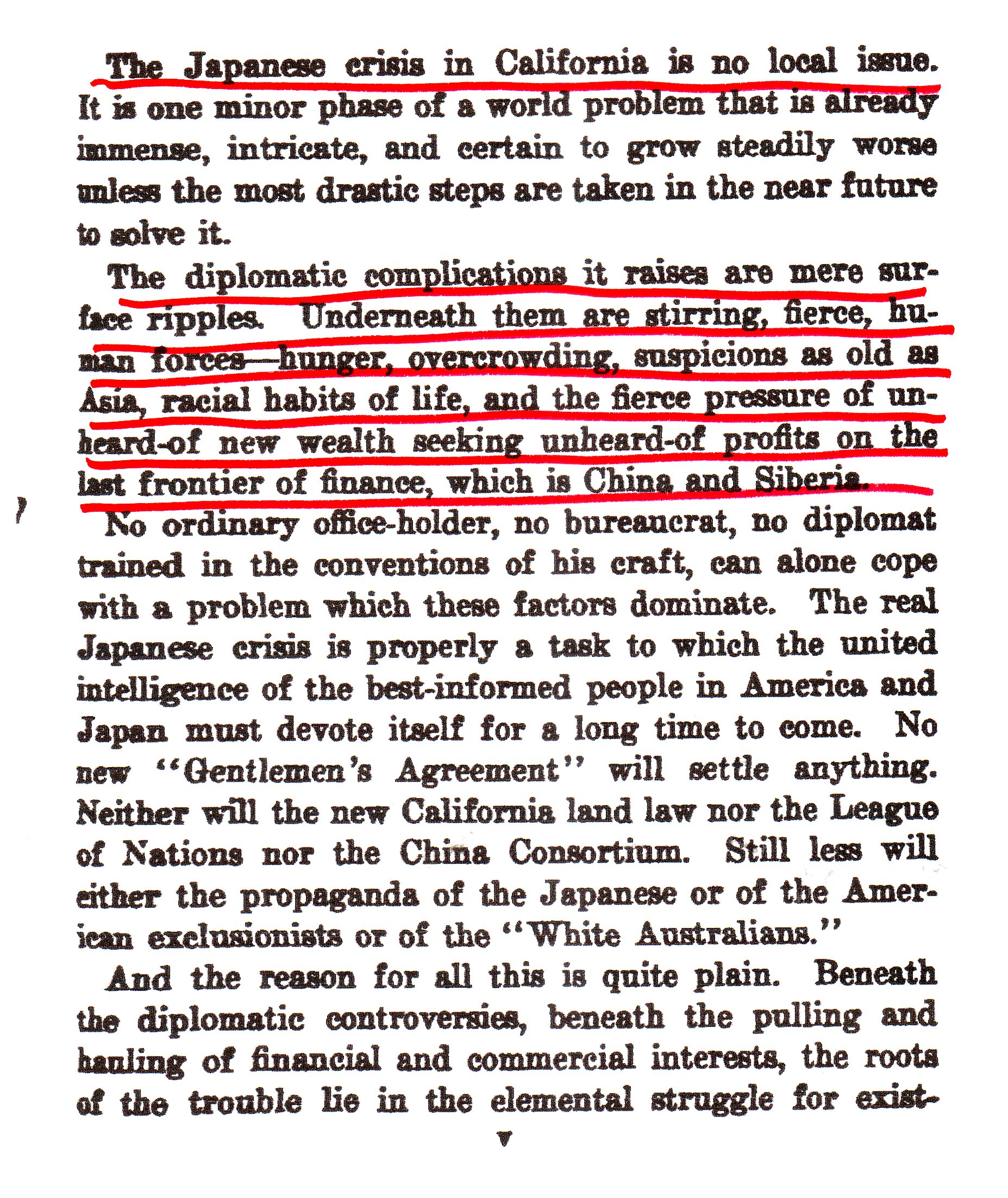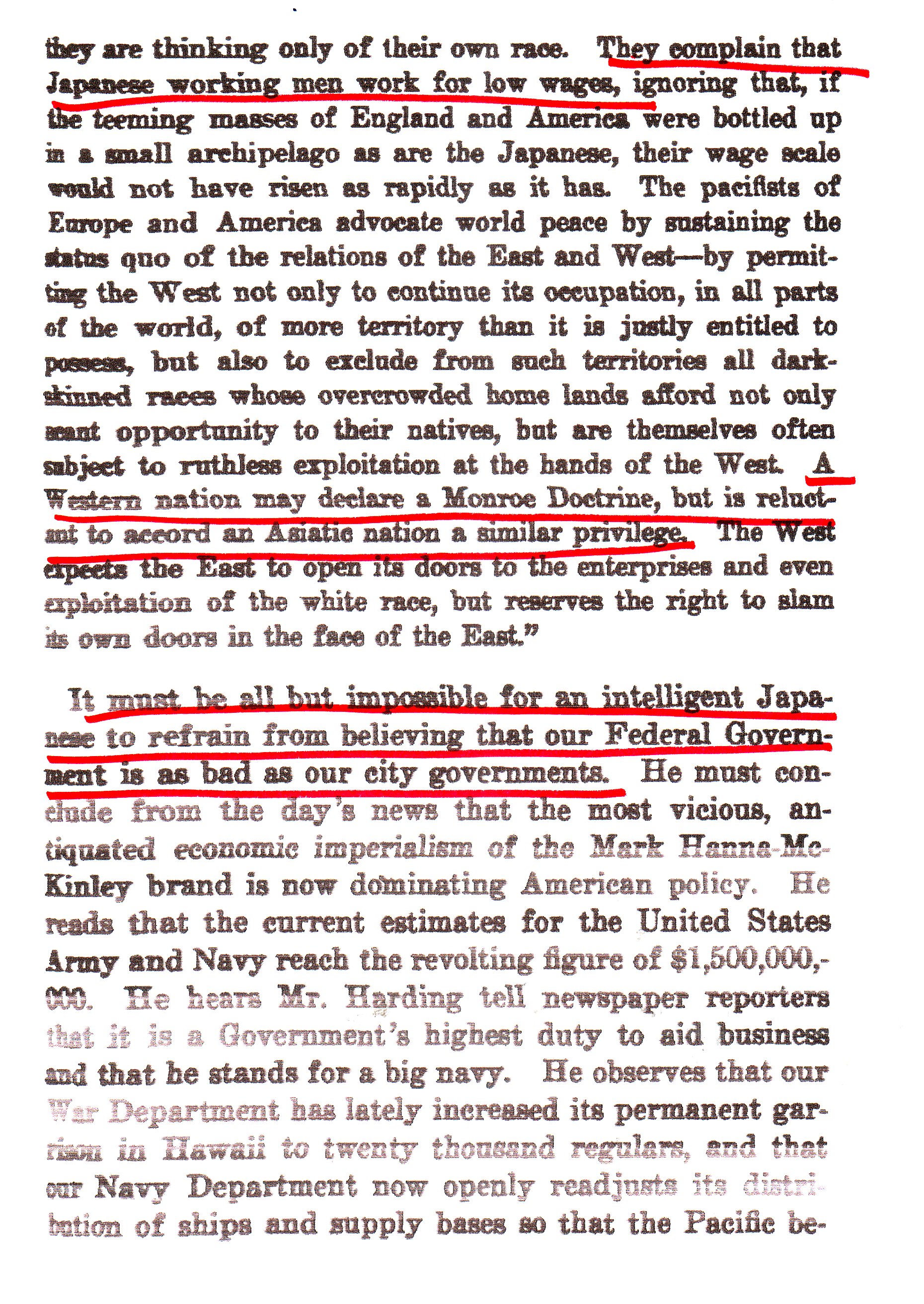 The author then talks about the anti-Japanese land laws, and other things that the U.S. was doing to “oppress” Japan.