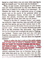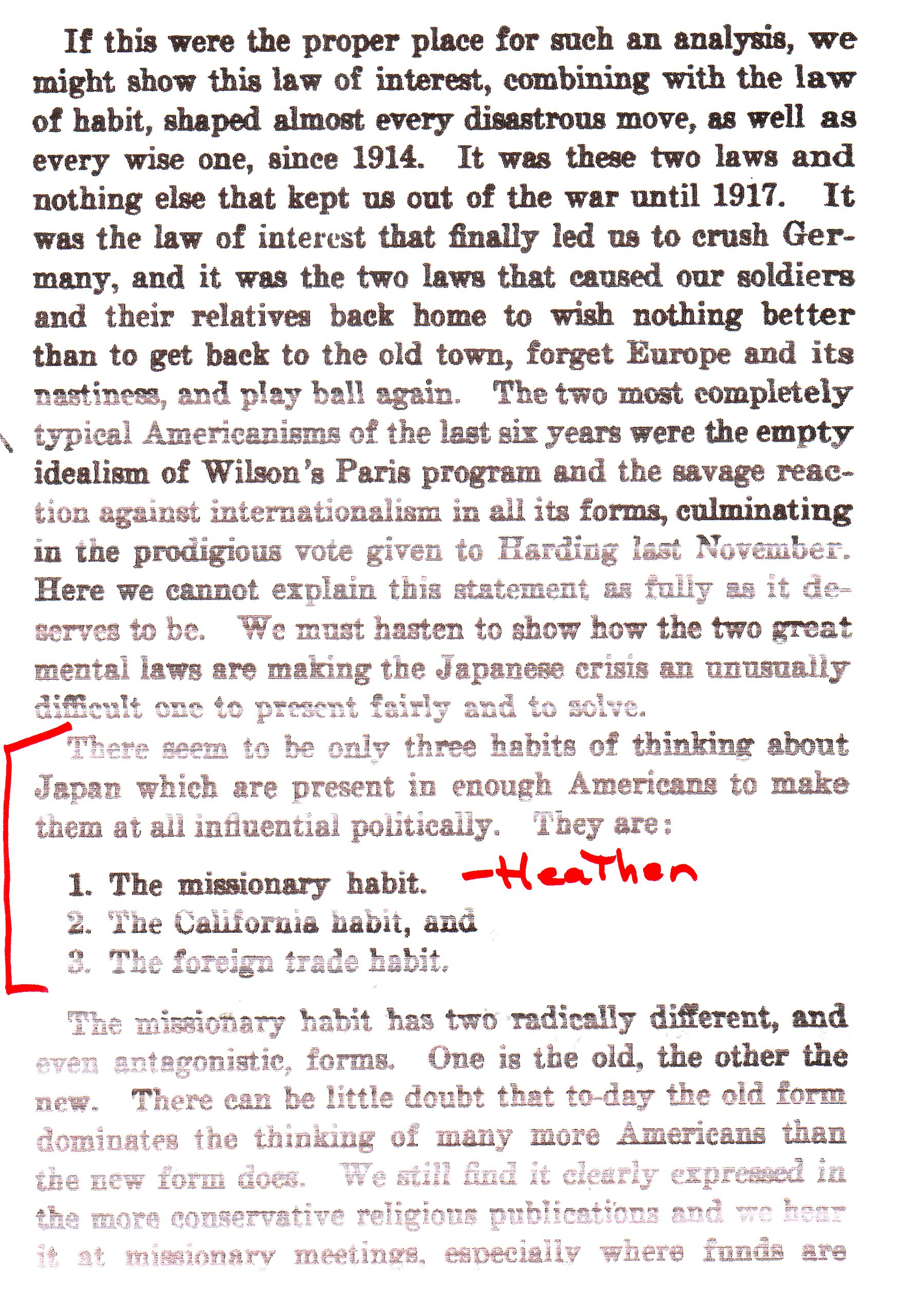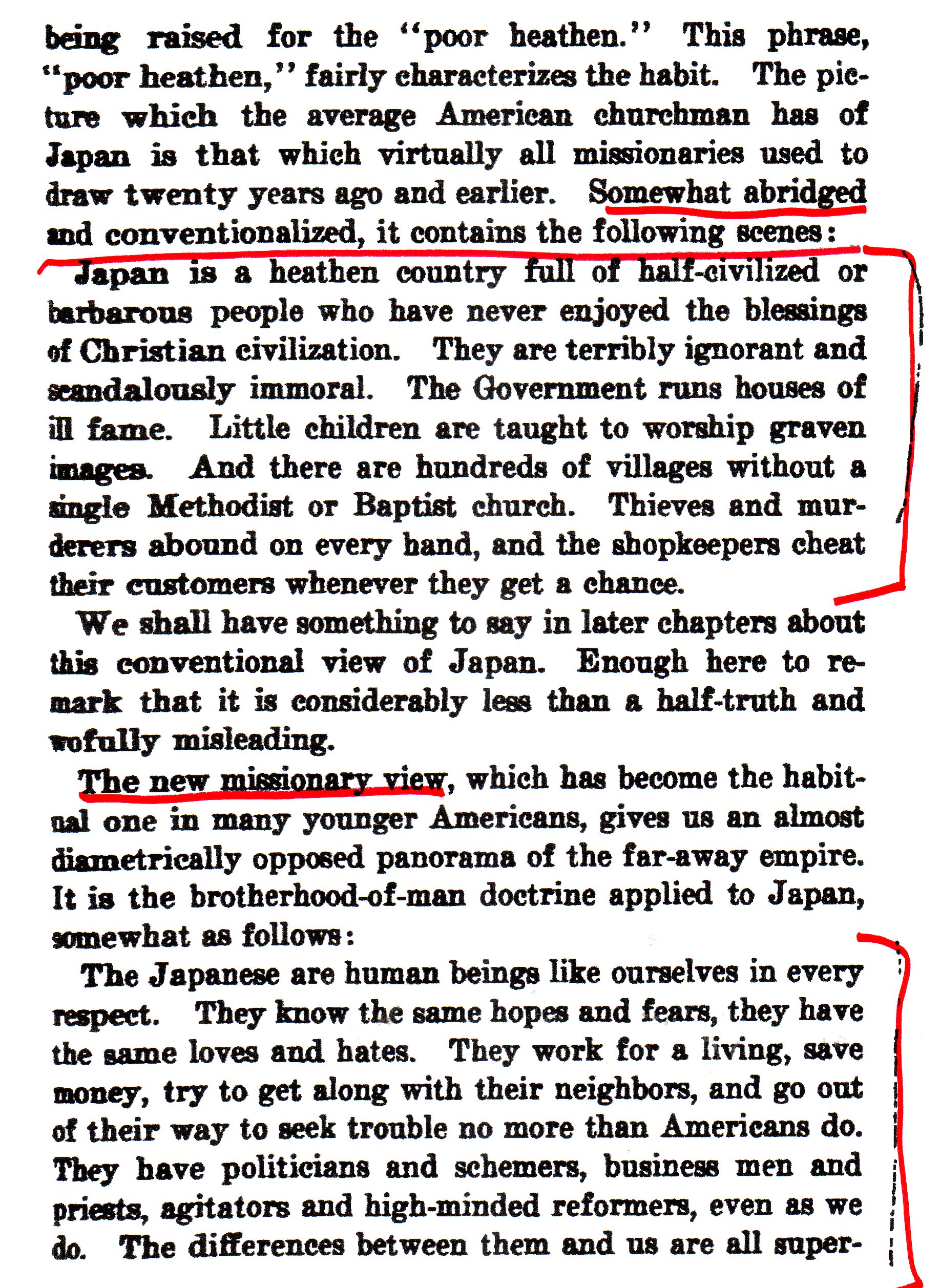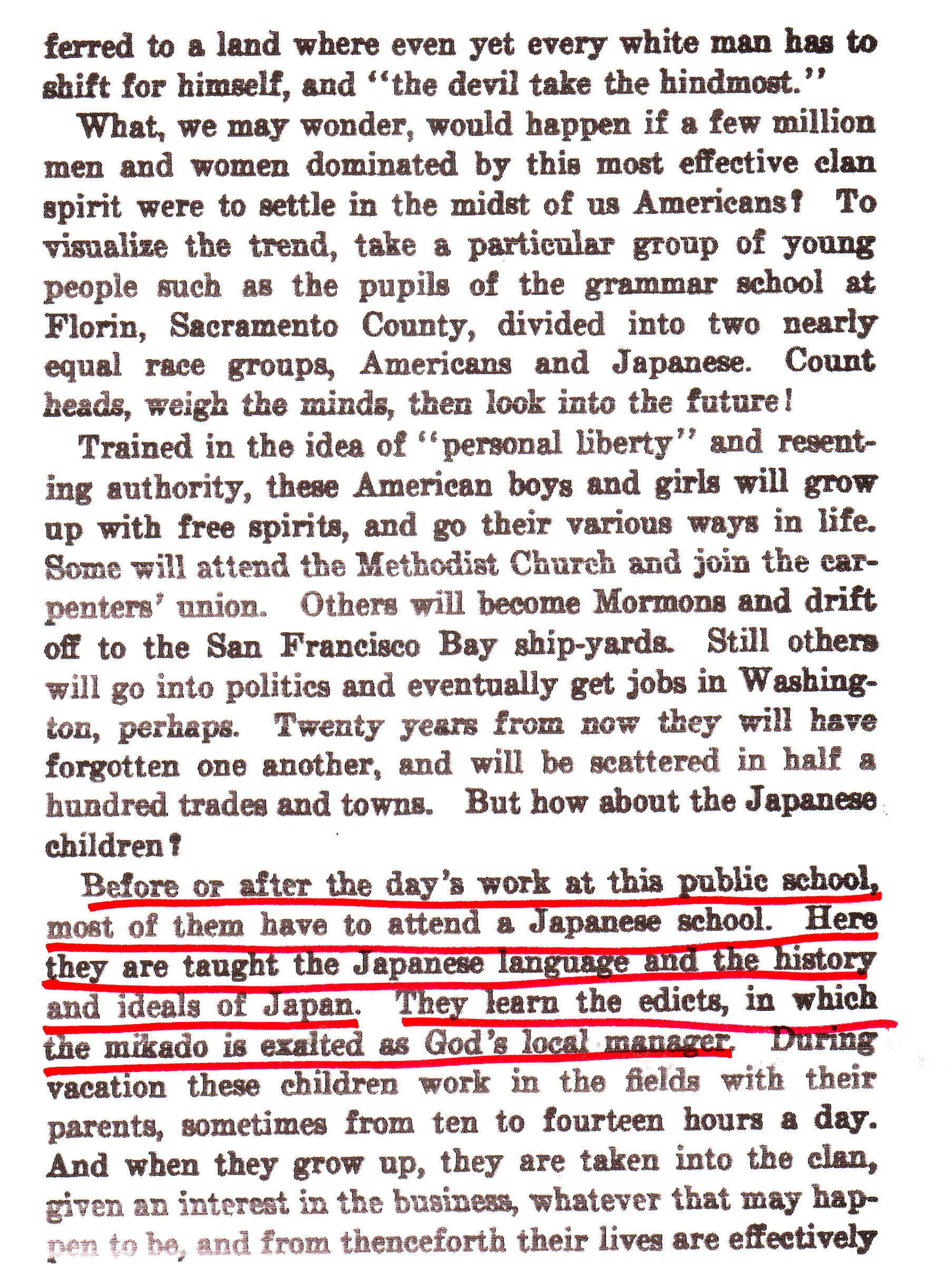 He discusses Japanese language schools, and how “...the mikado is exalted as God's local manager.” Mikado is another name for the Japanese emperor.