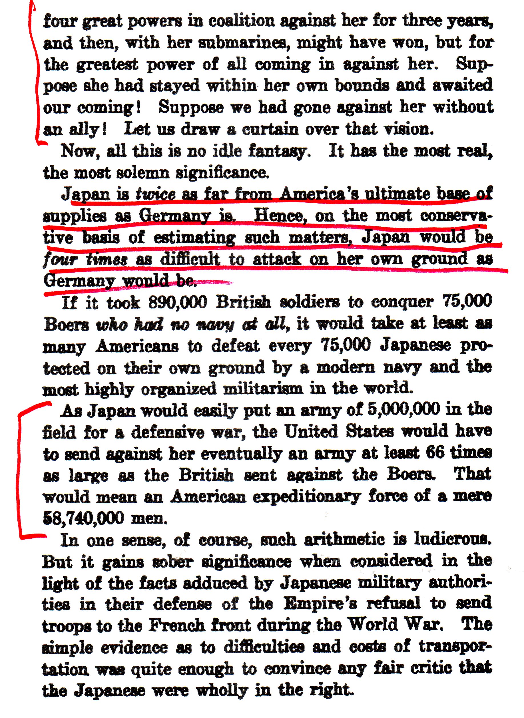 The author then goes on to talk some more about how hard it would be for the U.S. to fight in Japanese-controlled areas. Again, technology changed and such long-distance fights became possible.