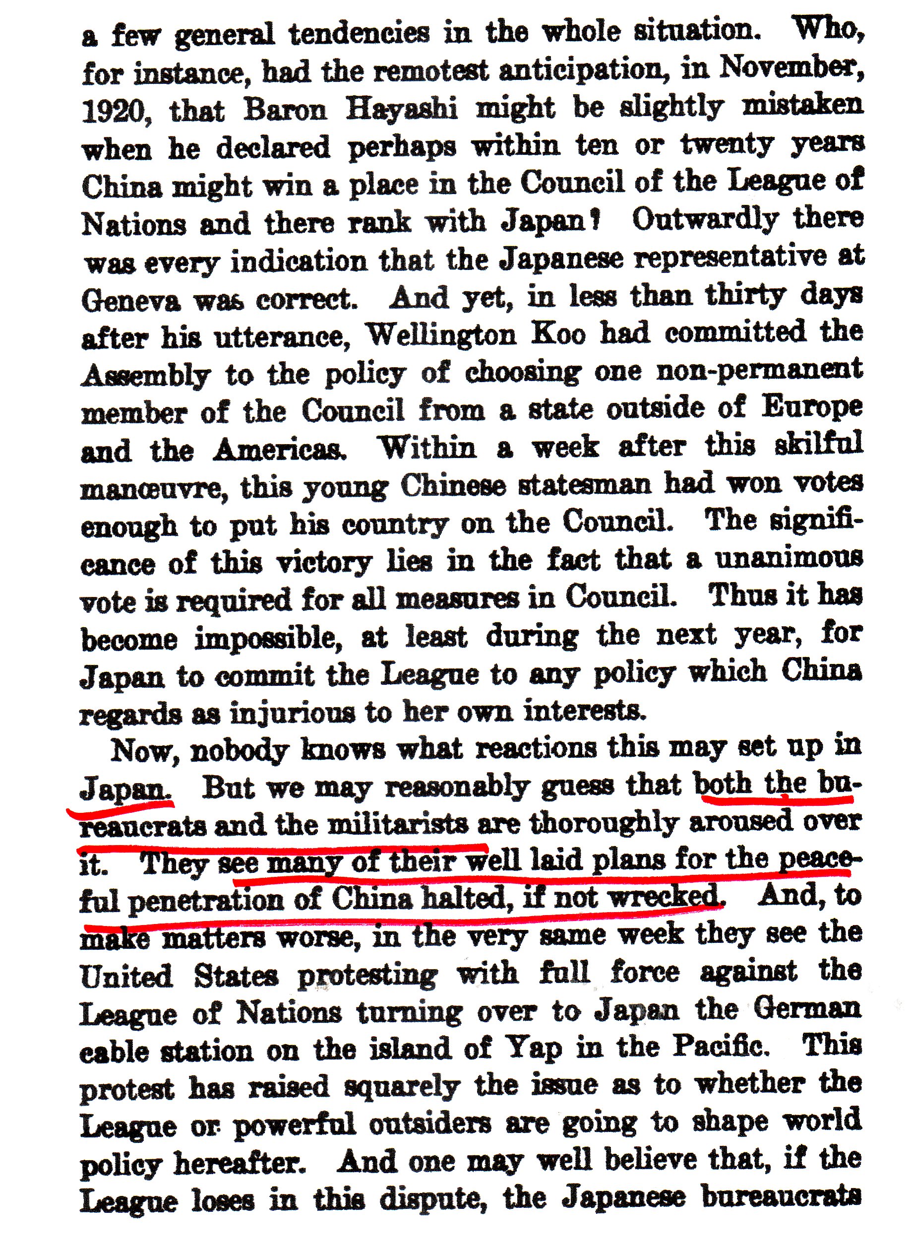 He then misses the boat about what would happen in China if the Japanese became aggressors. They were not, of course, thrown out. They were opposed, but Japan had a lot of success in taking over Chinese territory, at least early on in the war.