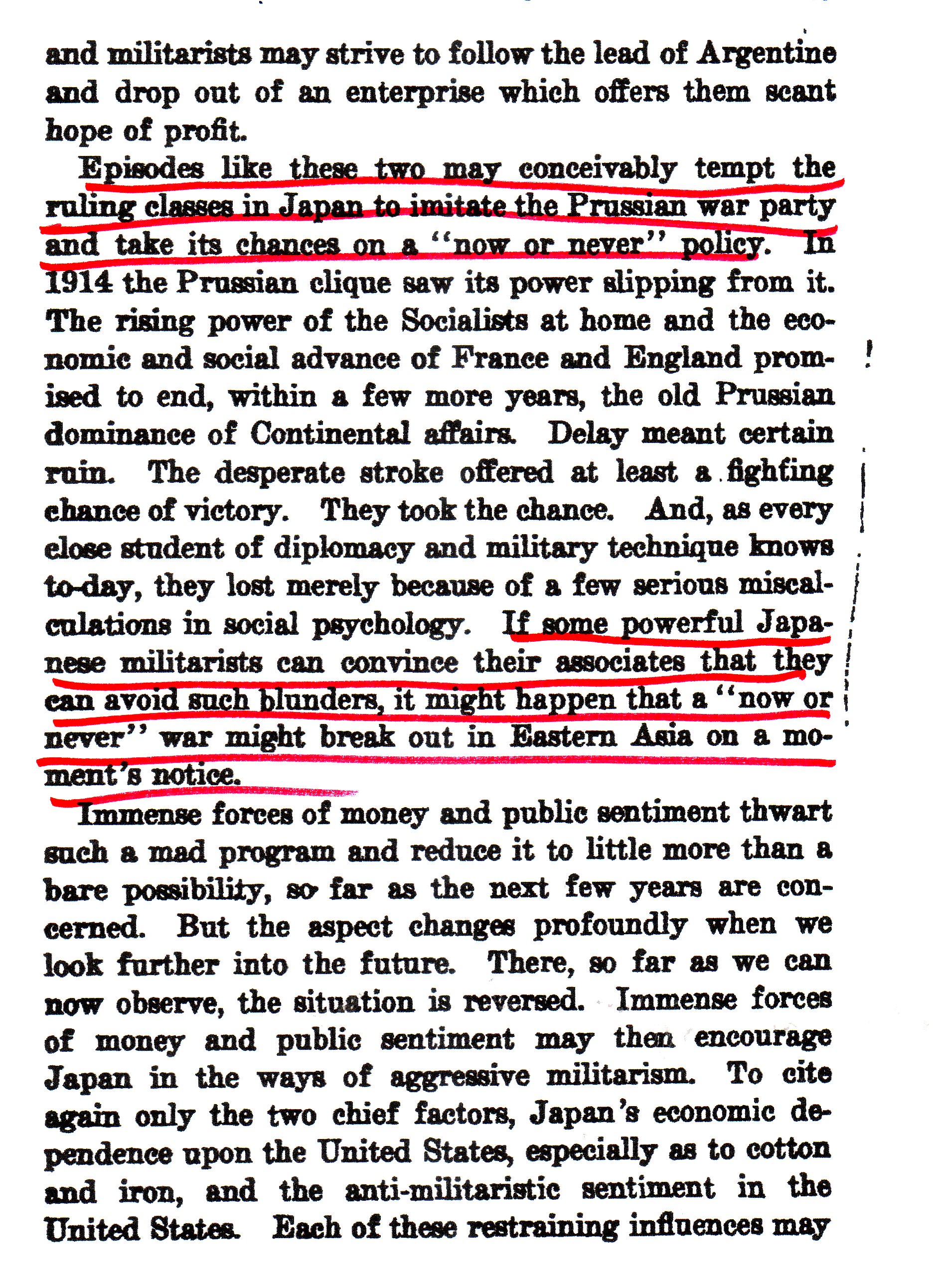 The author talks about the “now or never” approach to war, which is something that actually played a role in Japan's decision to attack the U.S. base at Pearl Harbor. Some of the leaders felt that if they did not act when they did, they would never be able to do what they wanted, as the U.S. would become too powerful.