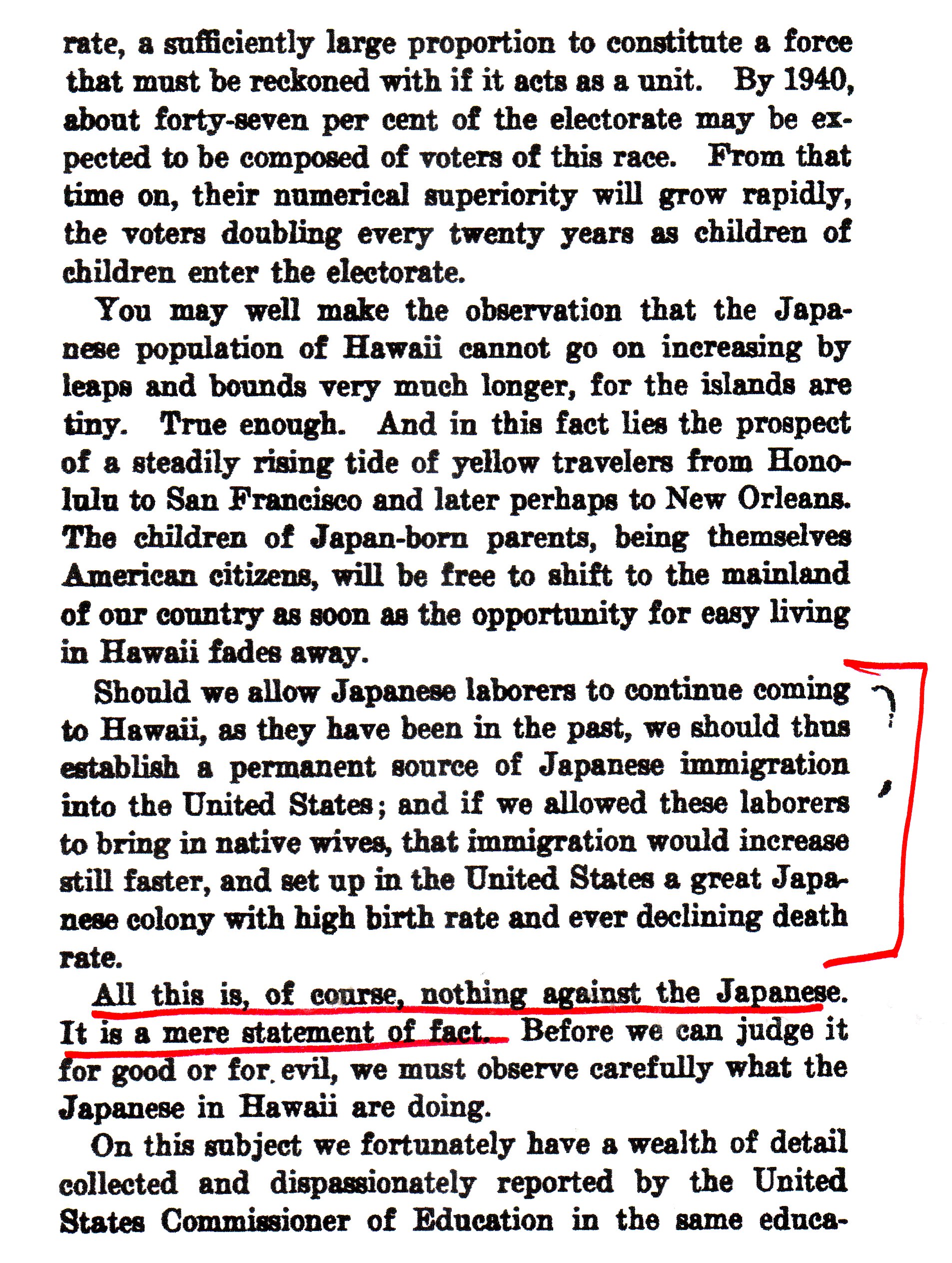He discusses Japanese immigration to the U.S. from Hawaii, and what effect this would have.