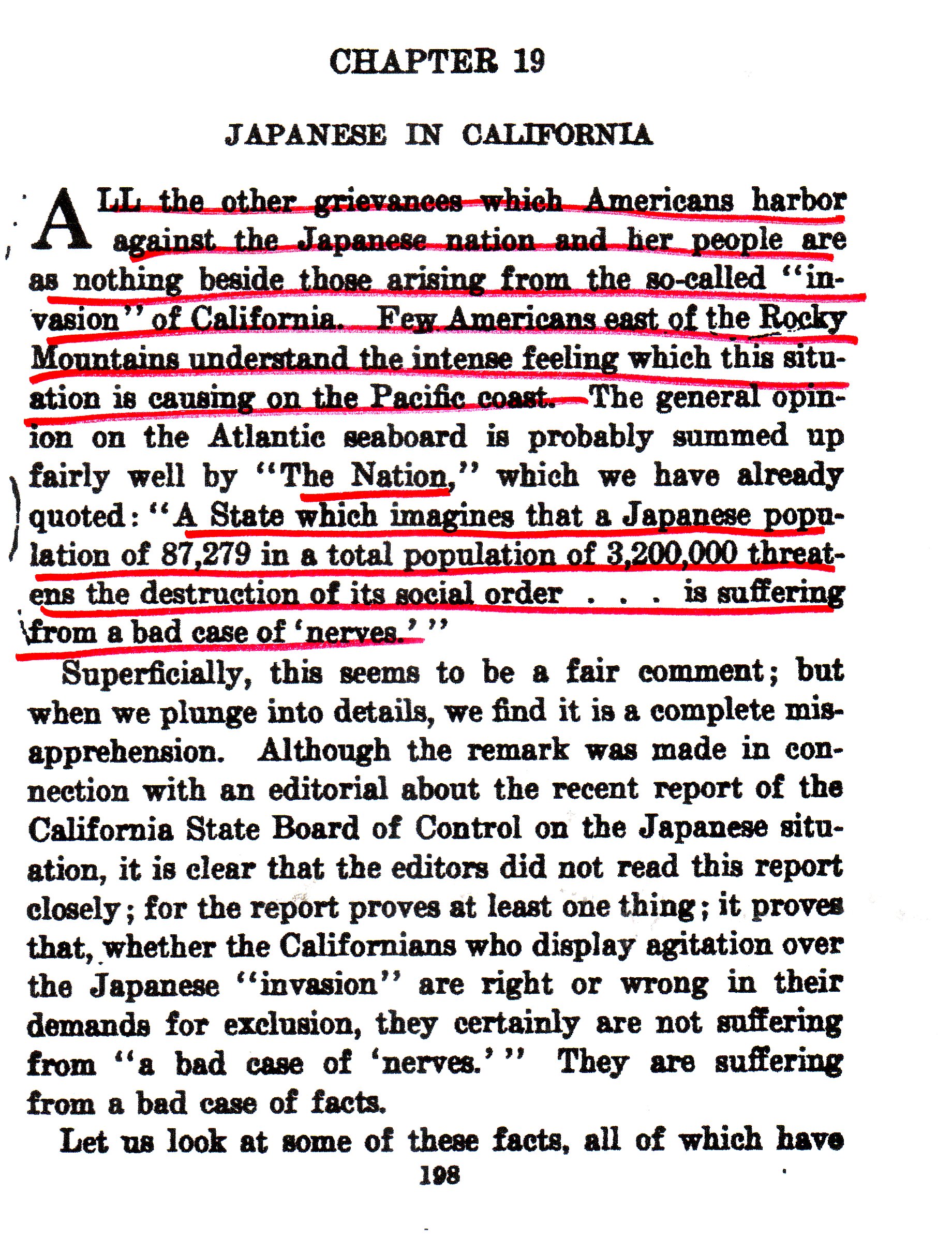 The author notes how people in the Eastern part of the U.S. couldn't quit understand how California felt about the Japanese, and how intense those feelings were. Remember that California already had gone through an anti-Oriental time, treating the Chinese much as they were treating the Japanese now. The Eastern part of the U.S. did not have enough Japanese or Chinese in it to stir similar feelings.