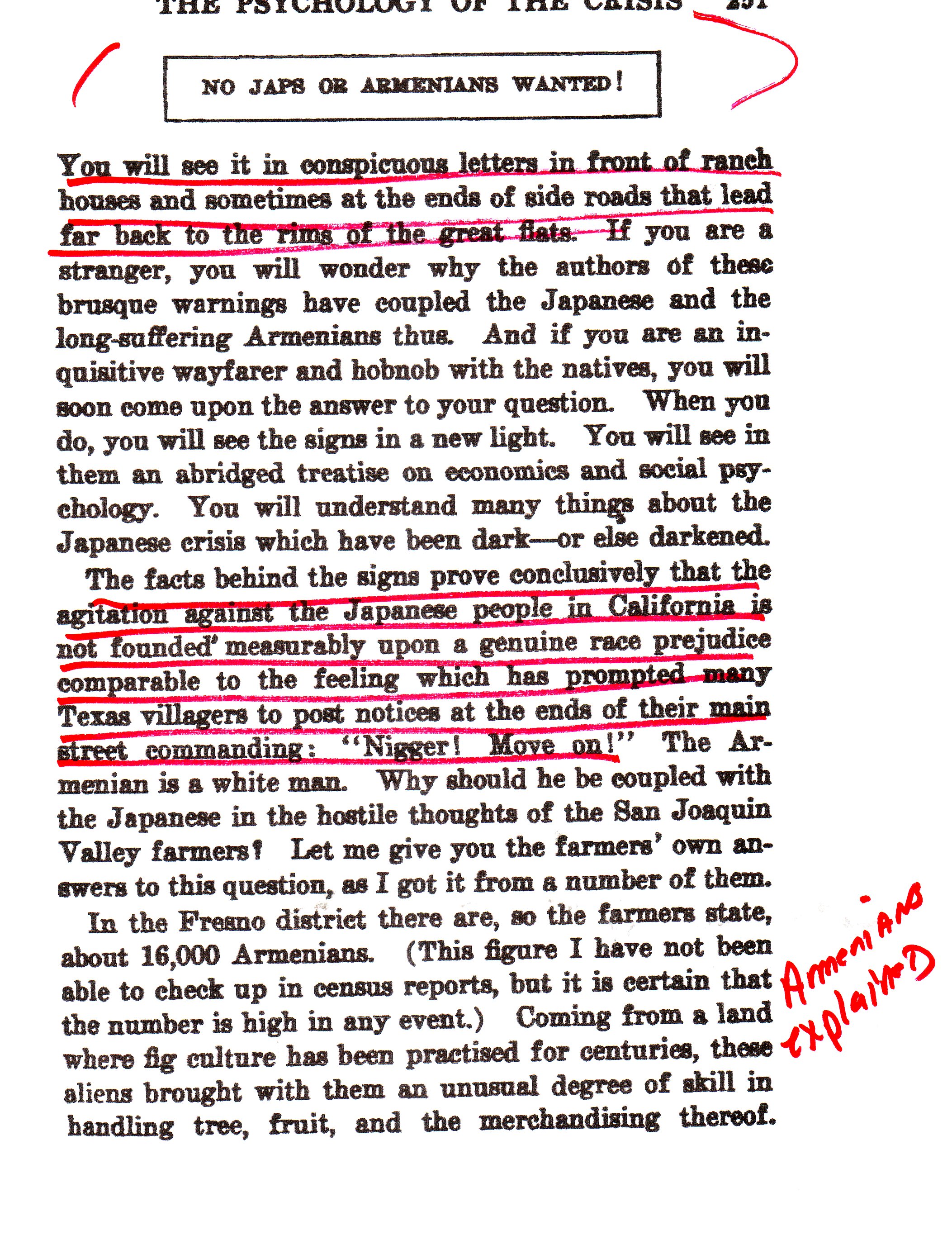 The author compares anti-Japanese prejudice with anti-black prejudice, and then explains about the Armenians; note the sign at the top about “No Japs or Armenians Wanted!”