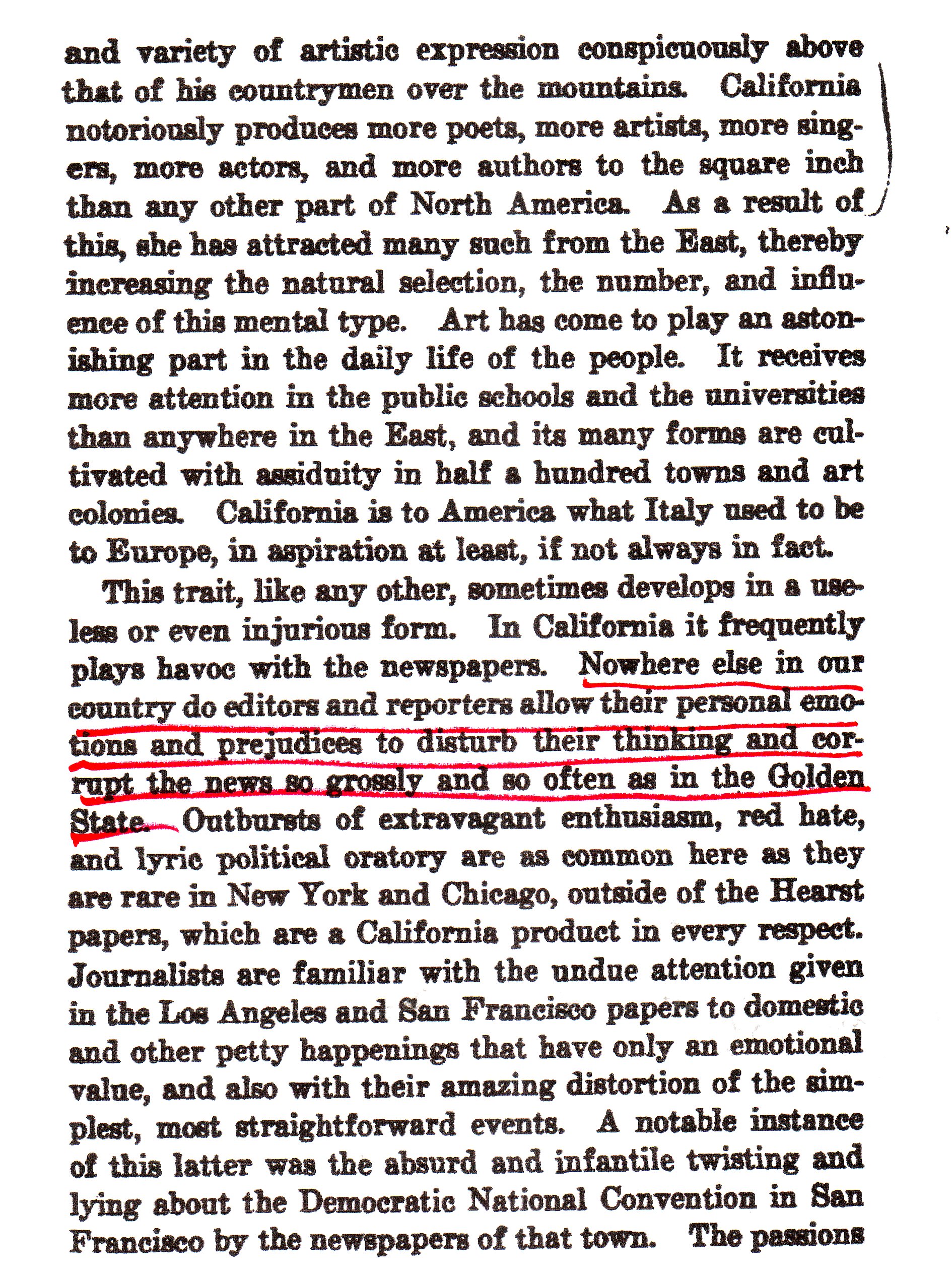He then talks about how the newspapers, particularly the Hearst papers, present the Japanese. It's very interesting that almost exactly the same things were said by the papers just prior to the outbreak of Pearl Harbor, something which undoubtedly contributed to the eventual internment of persons of Japanese ancestry in the West Coast states.