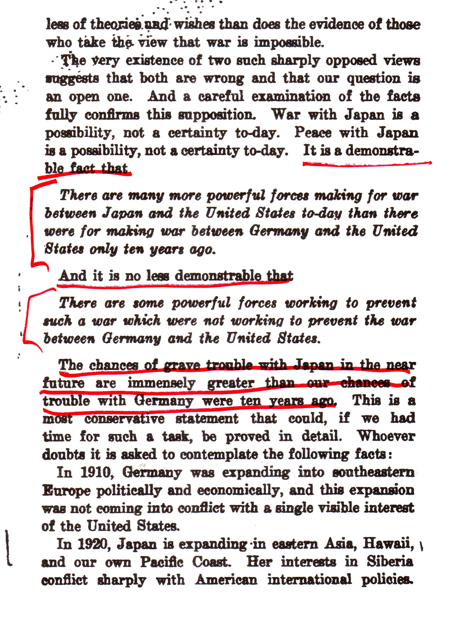 Here the author talks about why war is unlikely between the two countries, basically due to the distance between them. At the time of the book, this was true, but by the time of WWII there had been advances in technology that an attack on the continental U.S. possible, although still impractical.