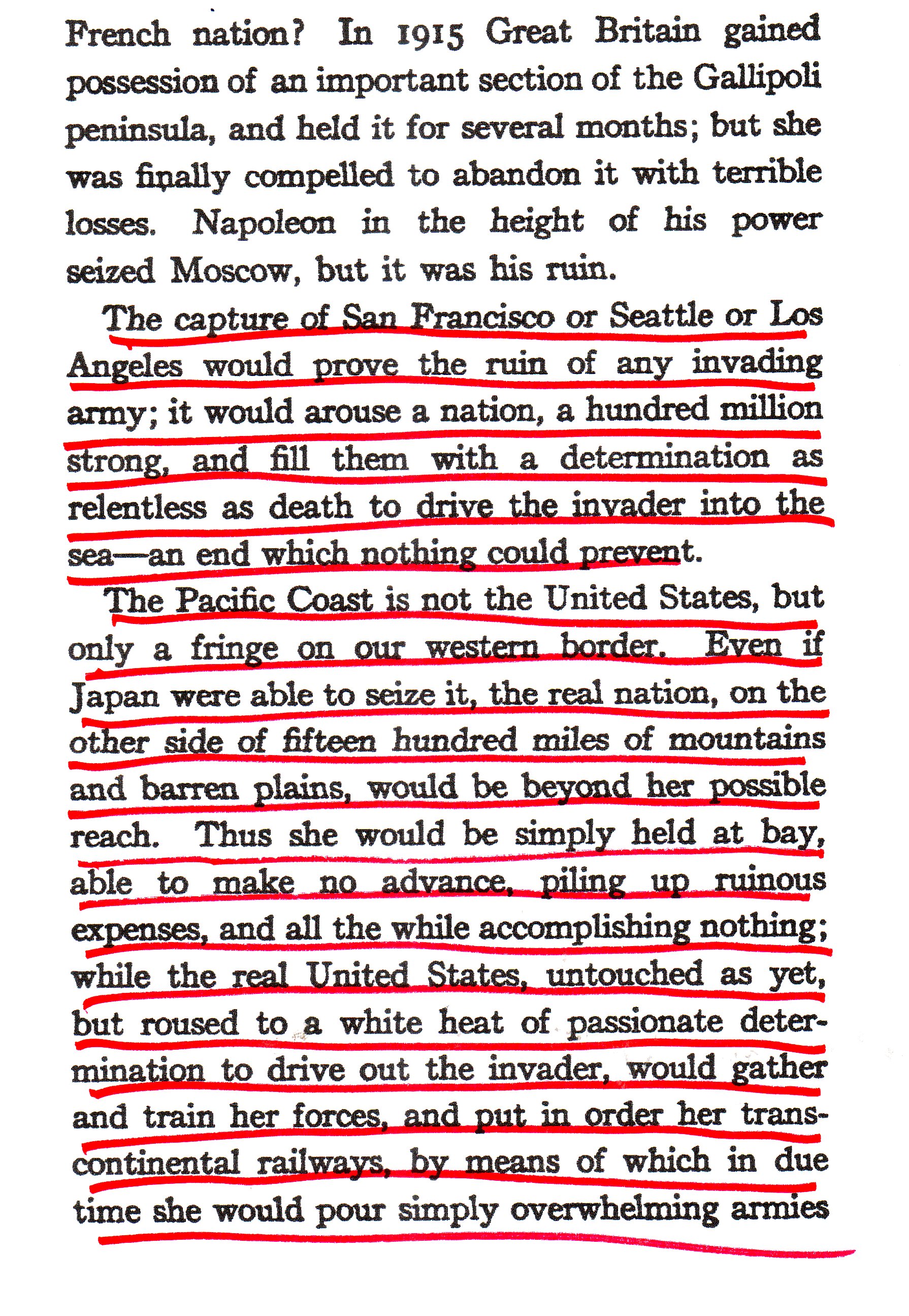 The author writes that if the Japanese did capture any West Coast cities, it would arouse the rest of the nation and the Japanese would be taught a severe lesson. It would be a matter of the chain of supply; the U.S. could move troops and materials easily within its border, but Japanese troops on American soil would be at the end of a very long, and vulnerable, chain of supply.