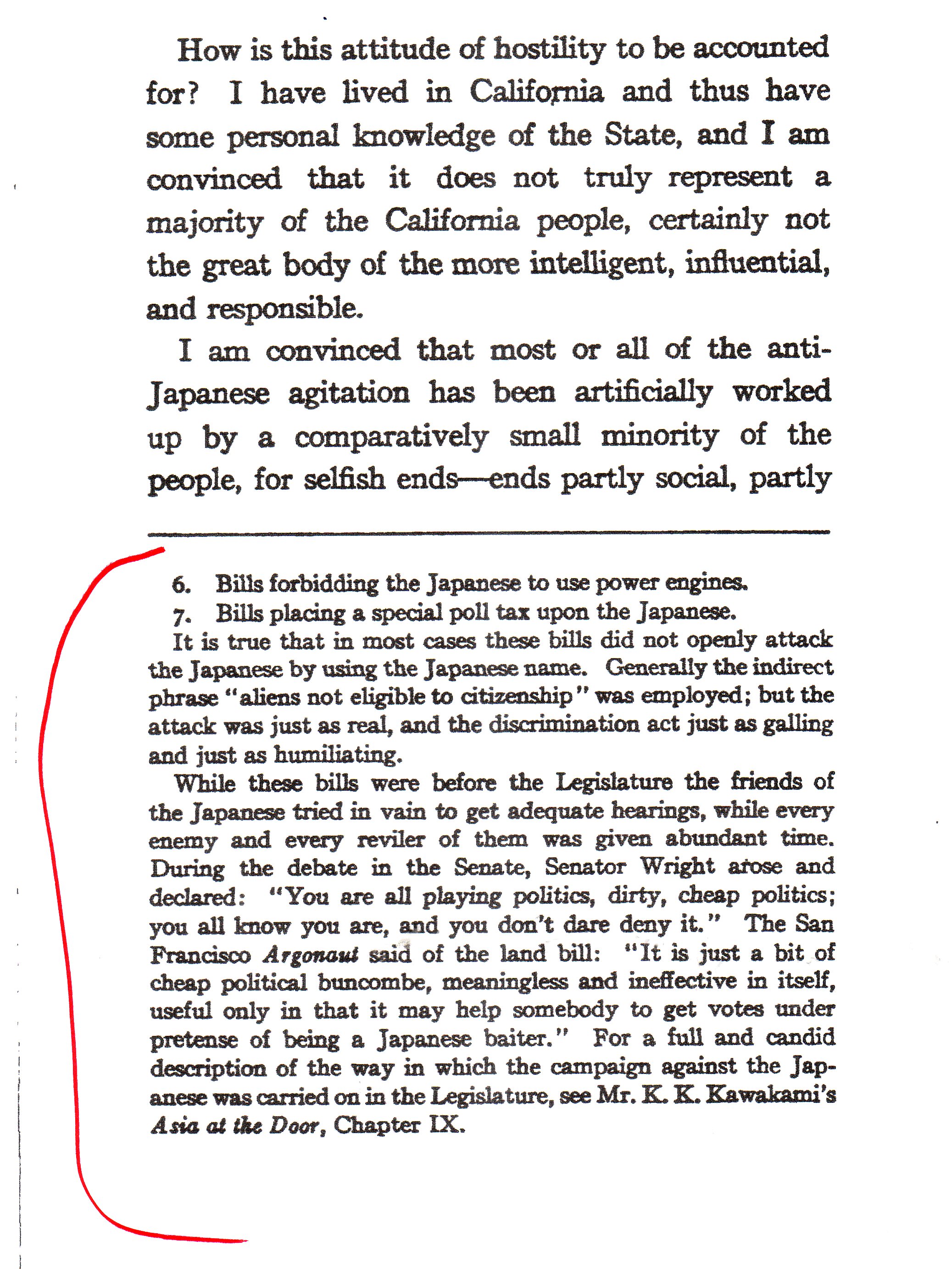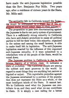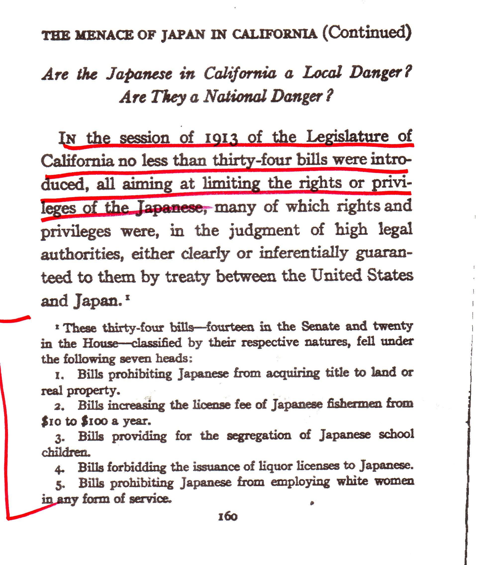 Some of the anti-Japanese bills introduced into the California legislature. The fifth one is quit interesting: “Bills prohibiting Japanese from employing white women in any form of service.” Talk about racial prejudice.