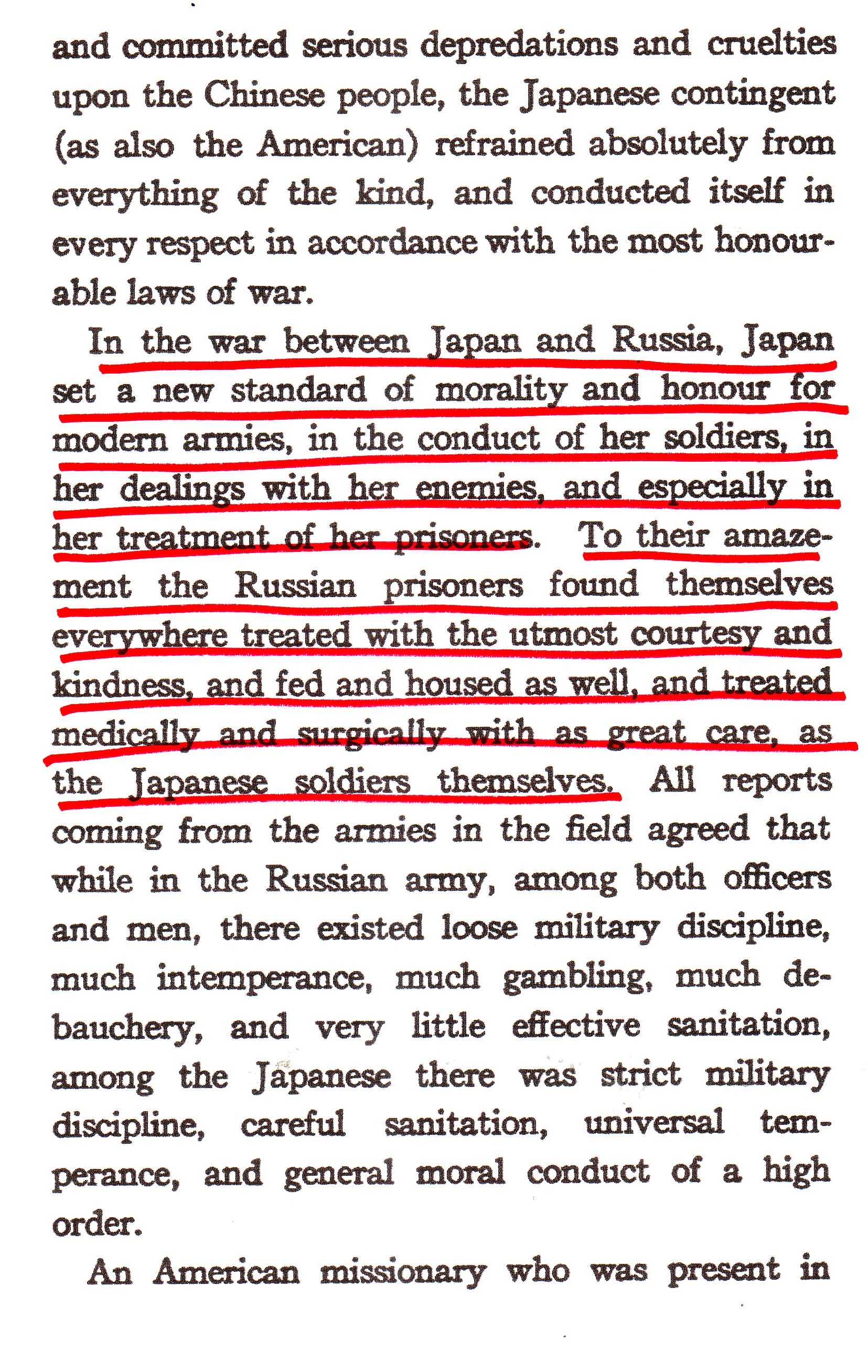 The author writes about how well the Japanese soldiers treated POWs in their war with Russia. Unfortunately, this changed horribly during the World War II when the Japanese soldiers committed numerous atrocities against POWs.