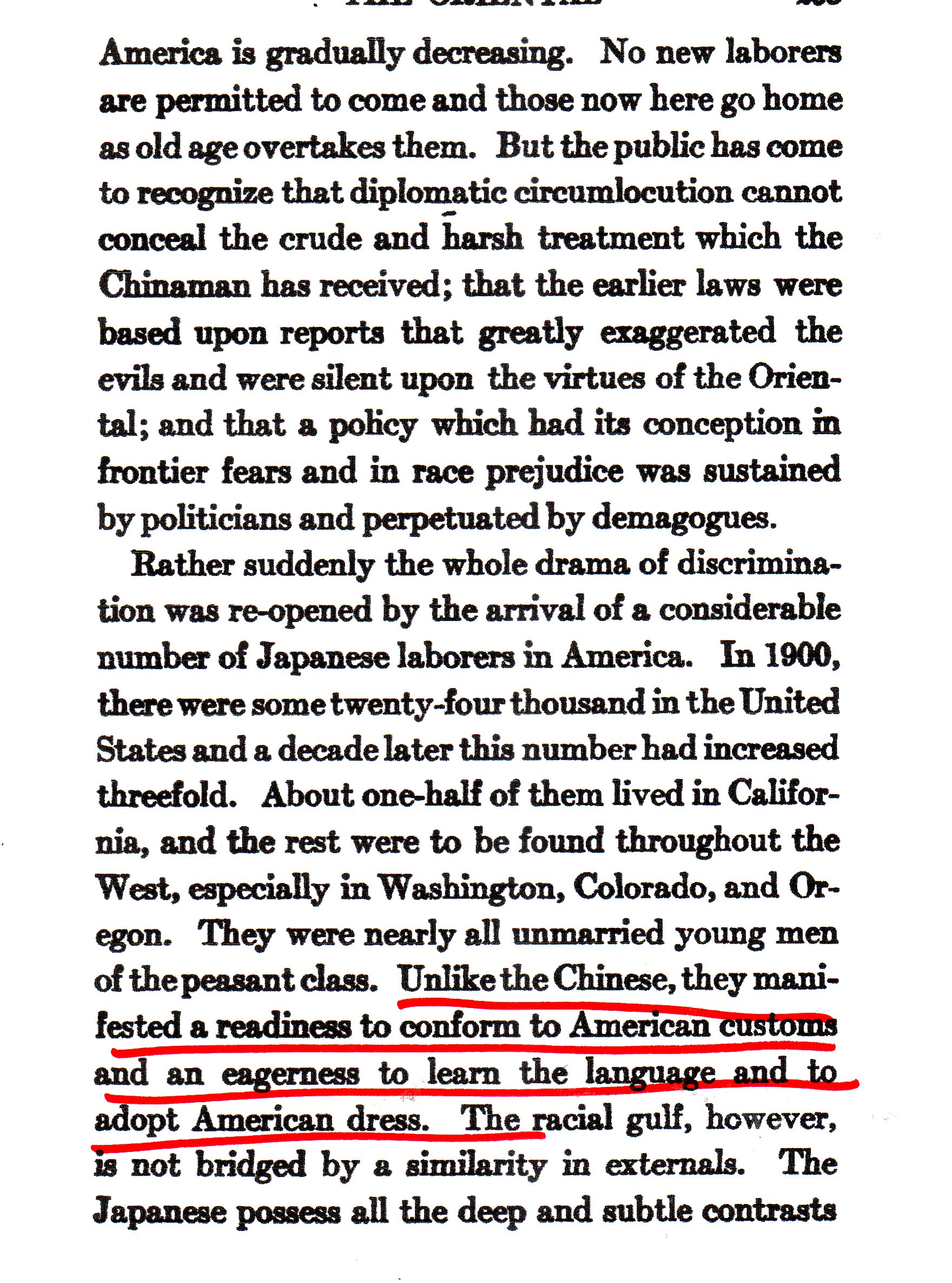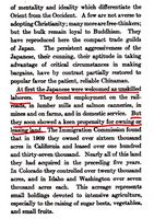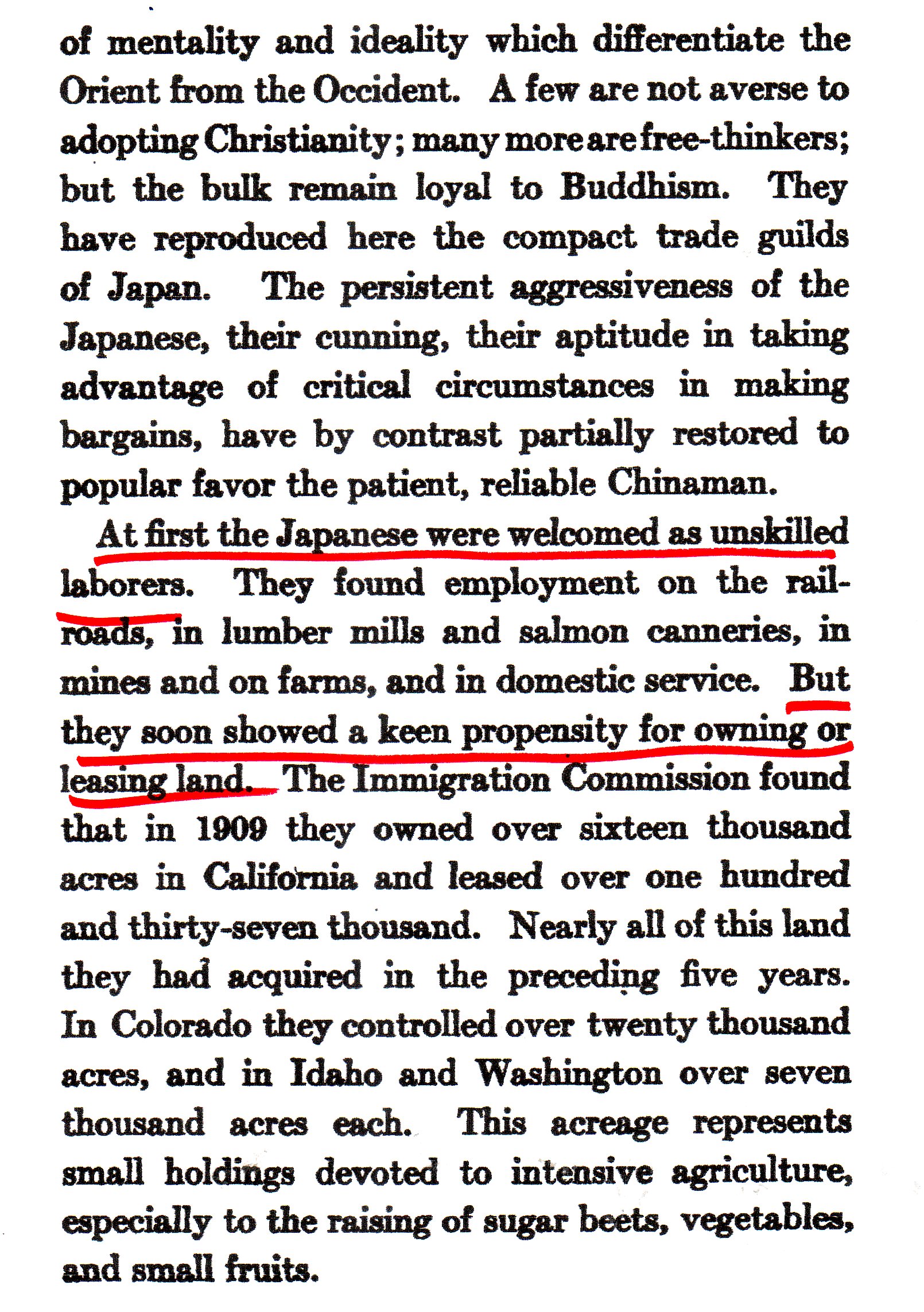 The Japanese were first accepted since they were unskilled workers and could be paid little. Later, as they began to succeed and get some money, they wanted to own their own land, and the white people didn't like that.