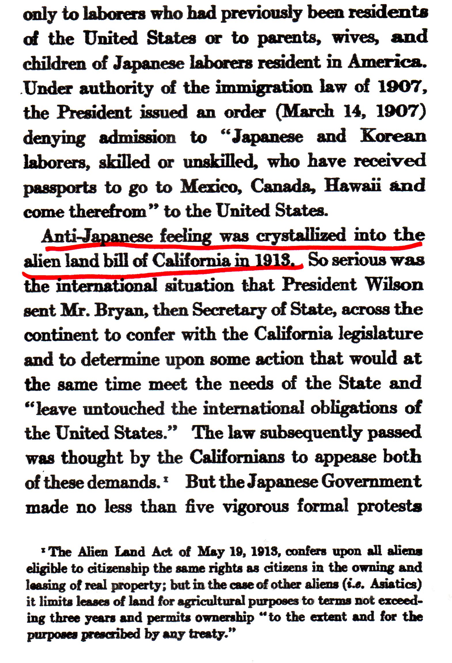 The anti-Japanese feeling in California led to the alien land bill of 1913.