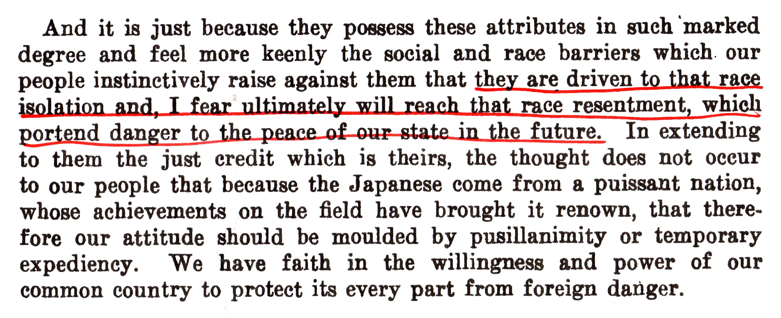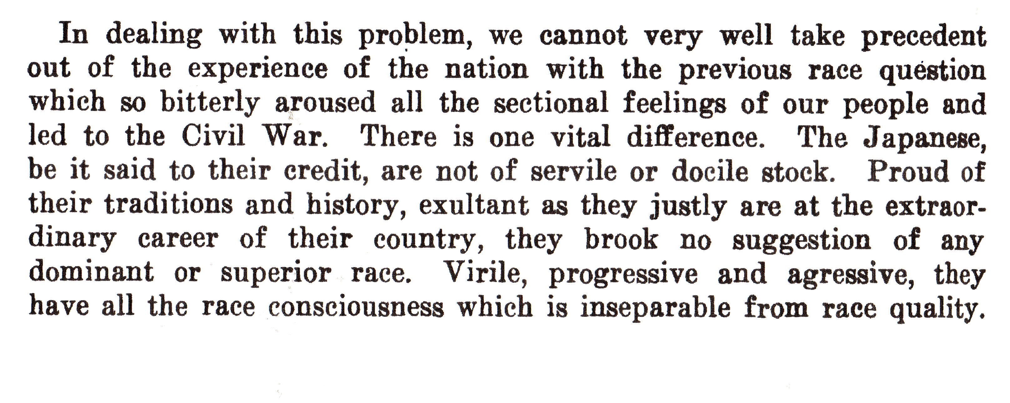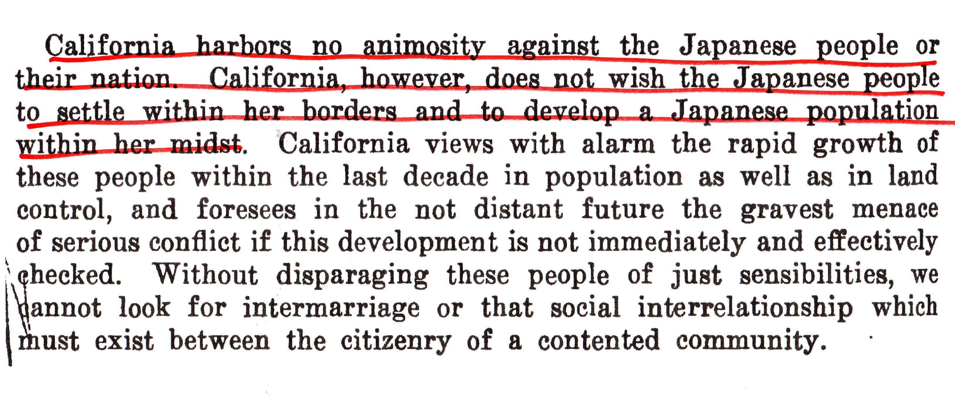 The author starts out by saying that “California harbors no animosity against the Japanese people or their nation” which was, at the time, a bald-faced lie.