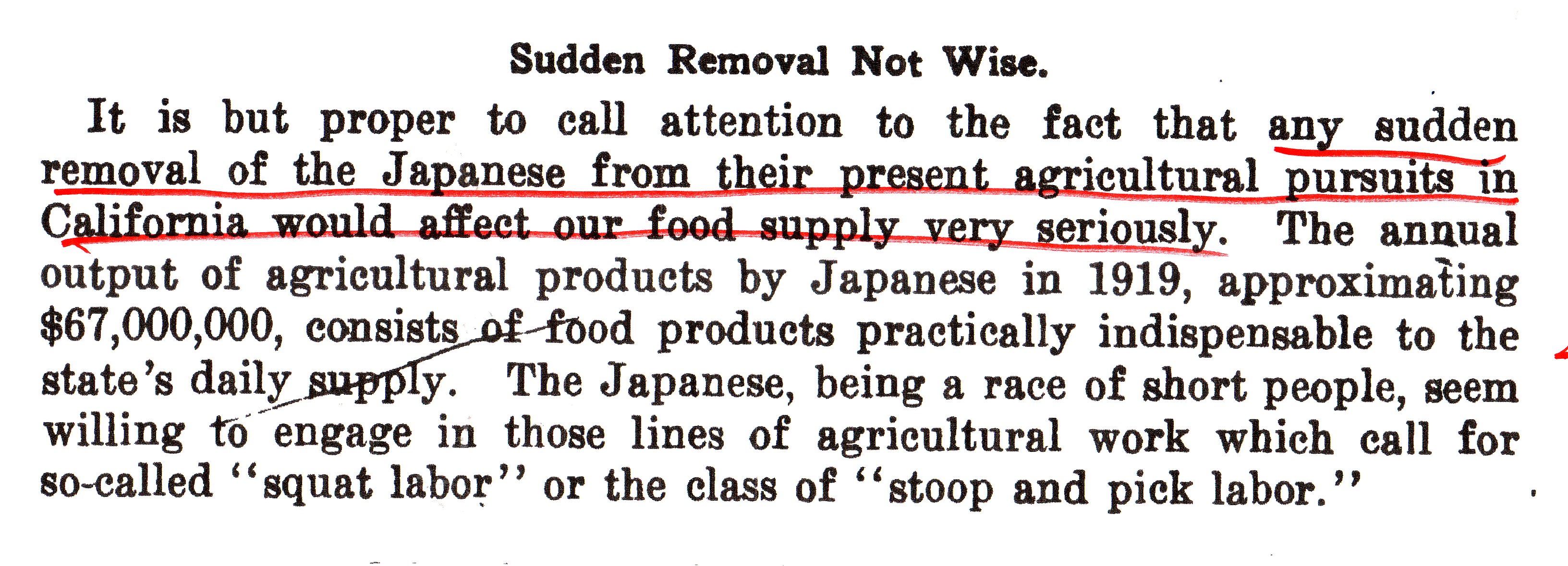 If the Japanese were removed suddenly, it would affect the California food supply “very seriously.” Now, if they are of “no appreciable value” as a farm laborer, then why would their removal be such a disaster to the food supply? The guy's own arguments work against themselves.