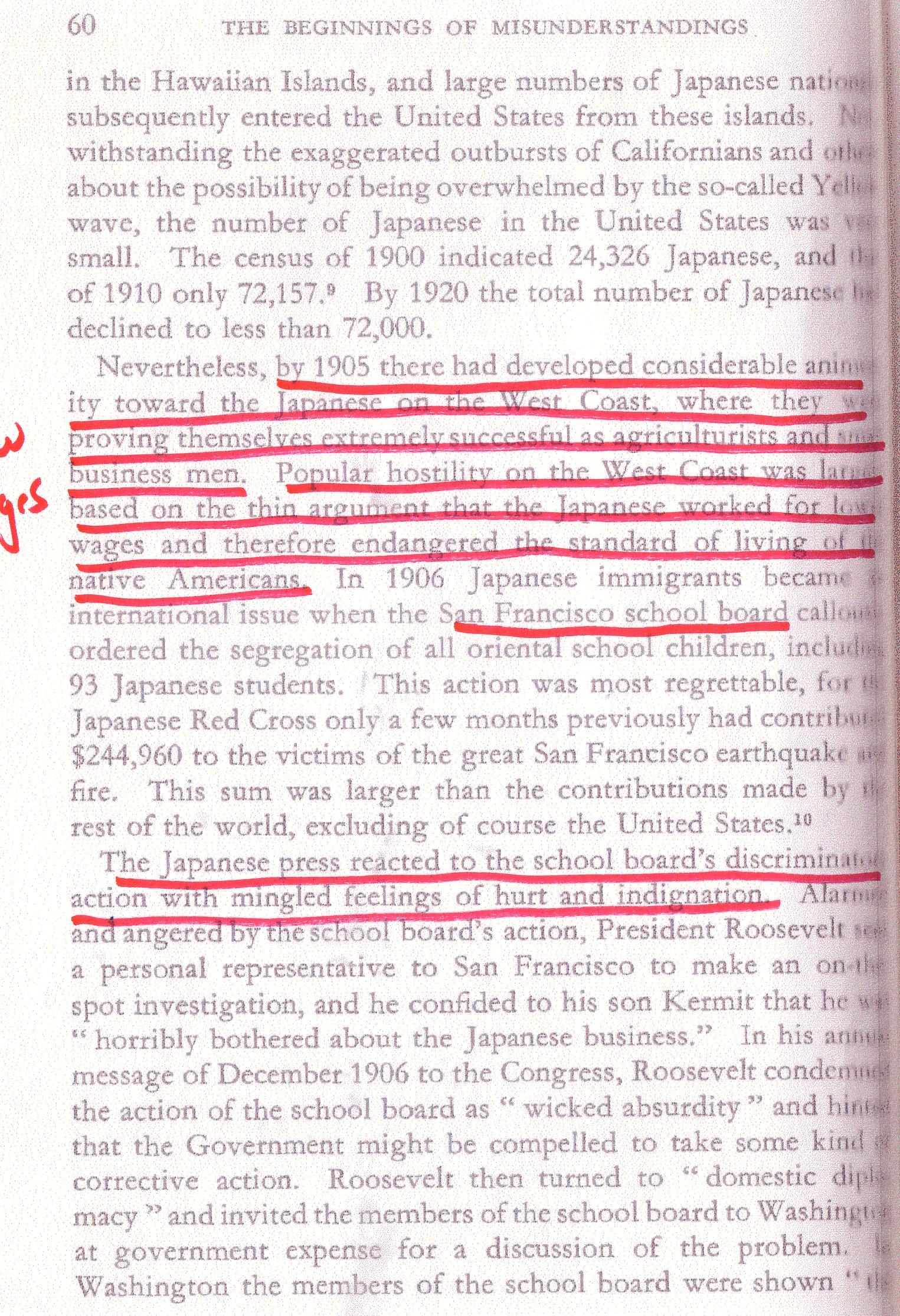 One of the arguments against the Japanese immigrants was that they worked for lower wages that others, and were thus able to take jobs away from those wanting more money. The section also talks about the San Francisco decision to segregate Japanese students, and how it was received in Japan.