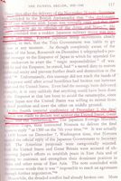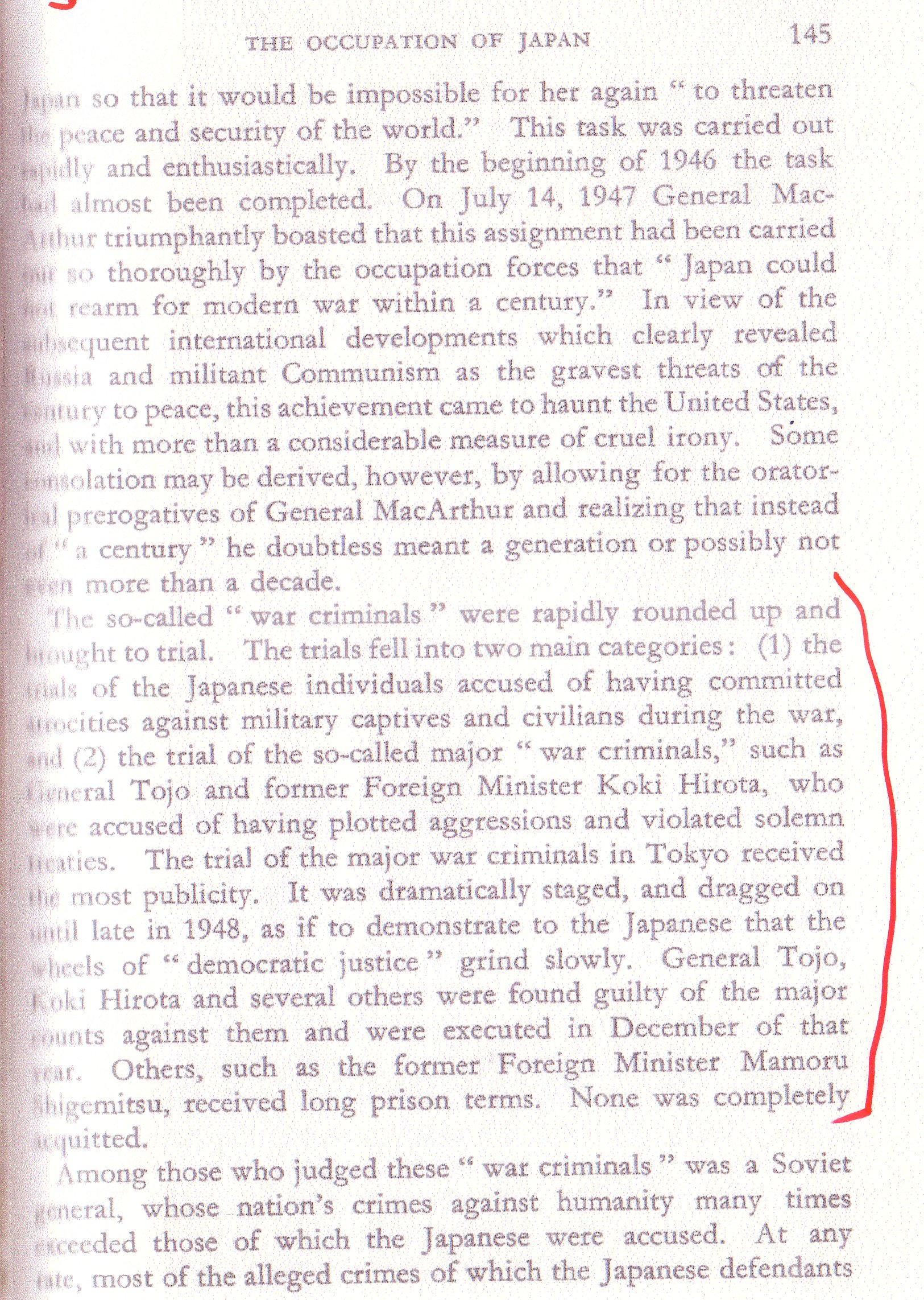 This part refers to the war crimes trials, noting that one group was men accused “of having committed atrocities against military captives and civilians during the war,” and the second group were the major war-time criminals like Tojo. A lot of the potential war criminals had, of course, already been killed in battle or committed suicide by the time of the trials.