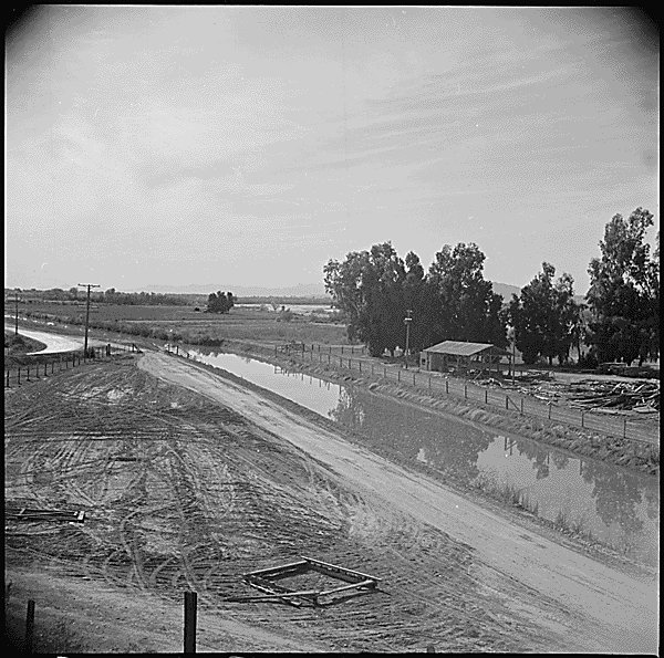 In the foreground can be seen the irrigation canal which will supply Poston with agricultural water. This canal receives its water from the Parker Dam. In the background can be seen the Colorado River. |