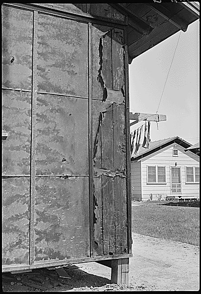 Corner of Barrack G in Block 34, where appointed personnel live at this relocation center, which was damaged by fire believed of incendiary origin. Building shown in background is the apartment occupied by Charles Smith, which was also damaged slightly by a similar fire discovered less than an hour earlier on the same evening. |
