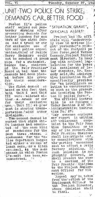 Page 1: Evacuee's property coming in; Poston residents offered supervisory positions; contaminated stream water may prove fatal; 400 for luau today; unit 2 gets mattresses; notarization of absentee ballots; Dr. Kazato heads II health facilities.
