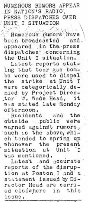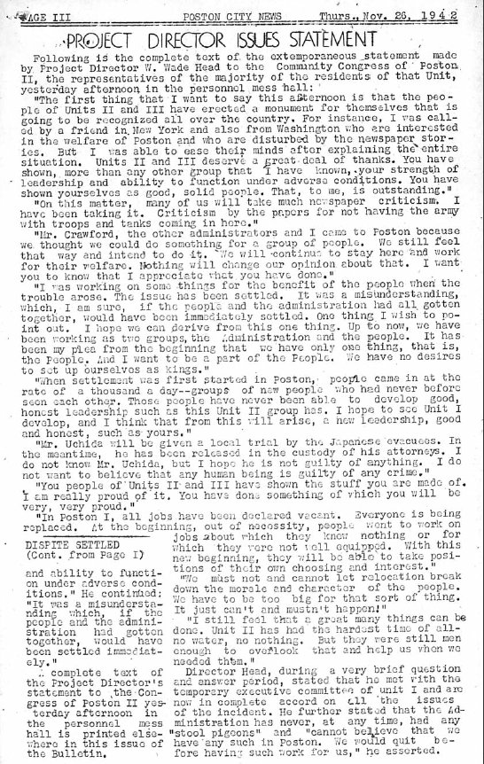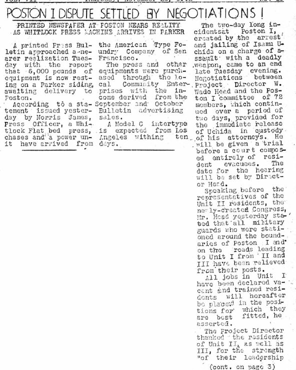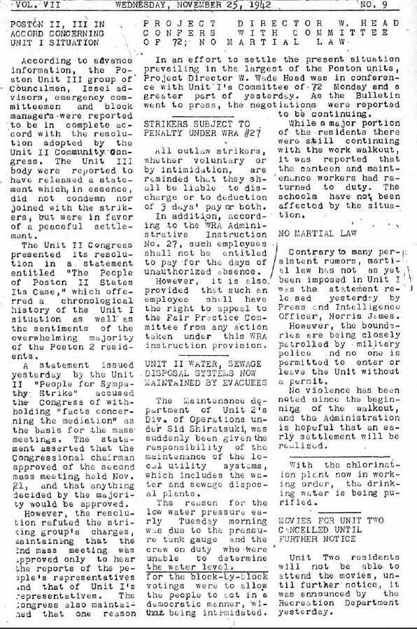 Page 1: Poston 2 creates congress; cooperation of loyal citizens lauded; Unit II residents to be paid Wednesday.