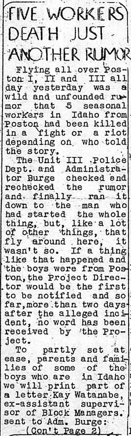Page 1: Nippon Army men block expression of liberalism; President Roosevelt reaffirms regulation on fair employment; Dr. Cary bares plan for summer; music makers provided fine orchestration; Brethren hostel takes 2 weekly from Poston; Poston industry in lead; Wade Head urges cooperation against center fire hazards; increase seen in departures; Indian service certificates issued here.
