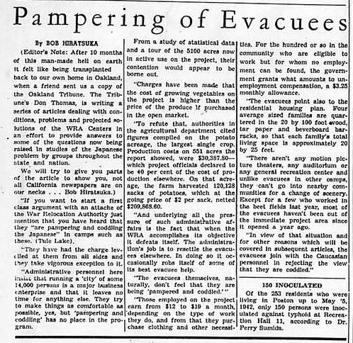 Page 1: NYA training agreement for relocation center's youths withdrawn; research bureau survey of English-speaking residents reveals 63% to leave center; Popkins reveals center figures for operation; evacuee property service require WRA forms; provisions made for expectant mothers and children; design dresses for leisure; clinic treats 4867 patients; Lamar merchants complain lack of evacuee business; seed germination rates released; letters to editor.