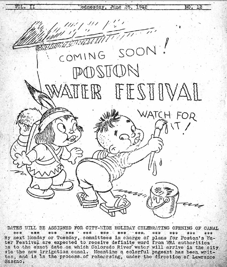 Page 1: Water festival planned for July 4th; more on the injuries from the train wreck; Poston population 7789, 3800 new citizens coming this week; swimming pools under construction; births.