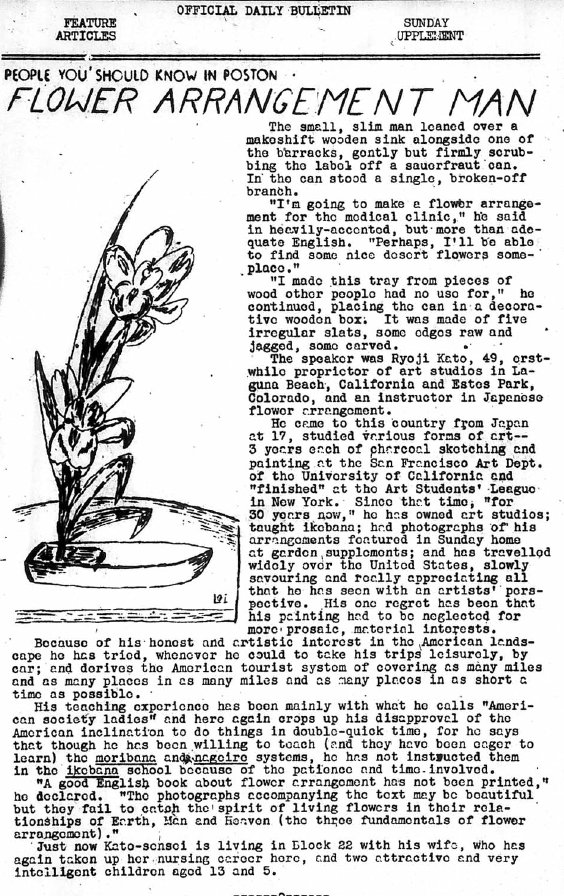 Page 1: Director and two other Poston leaders injured in train accident; five warehouses busy handing foodstuffs for community; sign department; Sunday services.