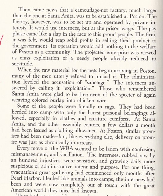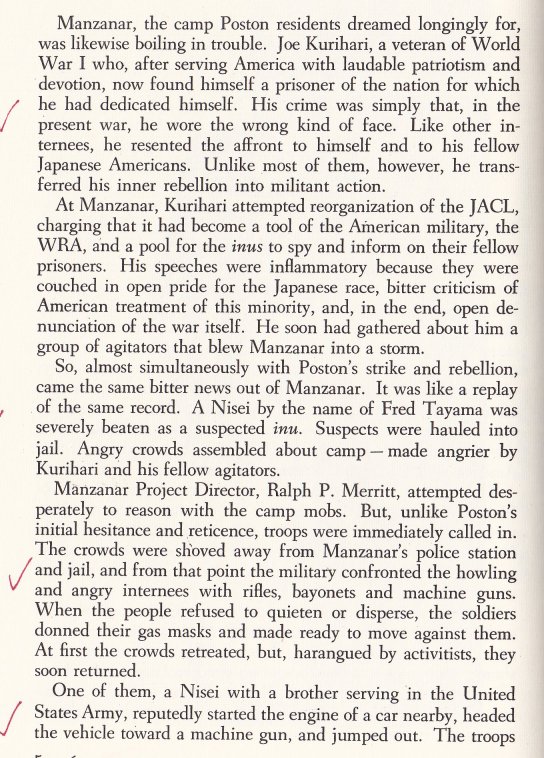 The author goes on to talk about how some people in the camps chose to give up their American citizenship, wanting to return to Japan. He also talks a lot about the 100th and 442nd units and their impact on how people thought about the Nisei.