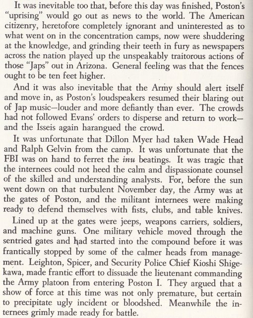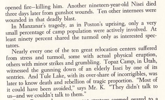 There was trouble at Manzanar, too, and it developed in a similar pattern to the trouble at Poston, except that, in this case, there were two deaths.
