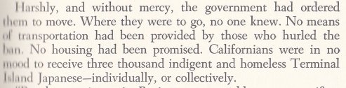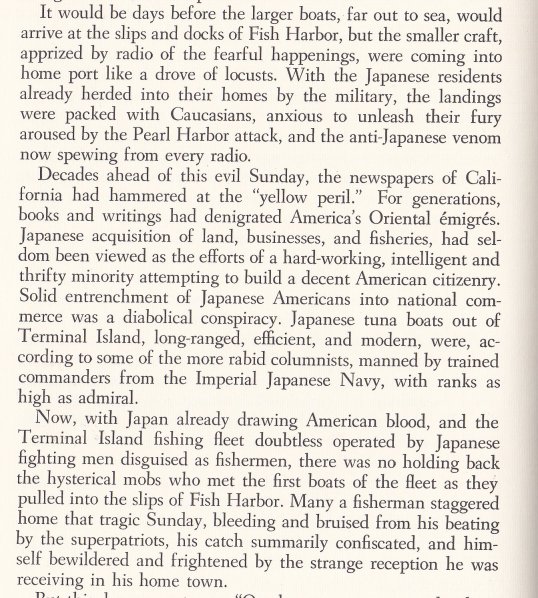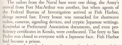 The book later moves into the time just after the attack on Pearl Harbor, and talks about Terminal Island, which was a Japanese fishing community. Then he goes on to describe what happened: